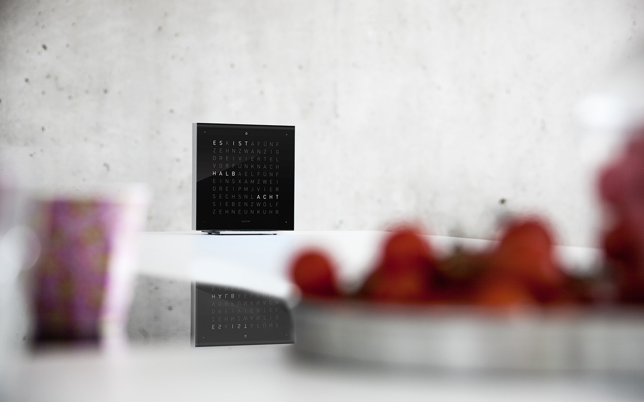 „QLOCKTWO TOUCH“ is a precision table clock with an alarm function and comes from BIEGERT & FUNK. The clock shows the actual time with a matrix from letters in written words – just as its big sister, the QLOCKTWO CLASSIC. A special silkscreen process gives a high definition look to the letters illuminated in brilliant white LEDs. The monolithic corpus is milled smoothly from a single aluminum block. The ensemble represents a milestones in the design of table clocks.