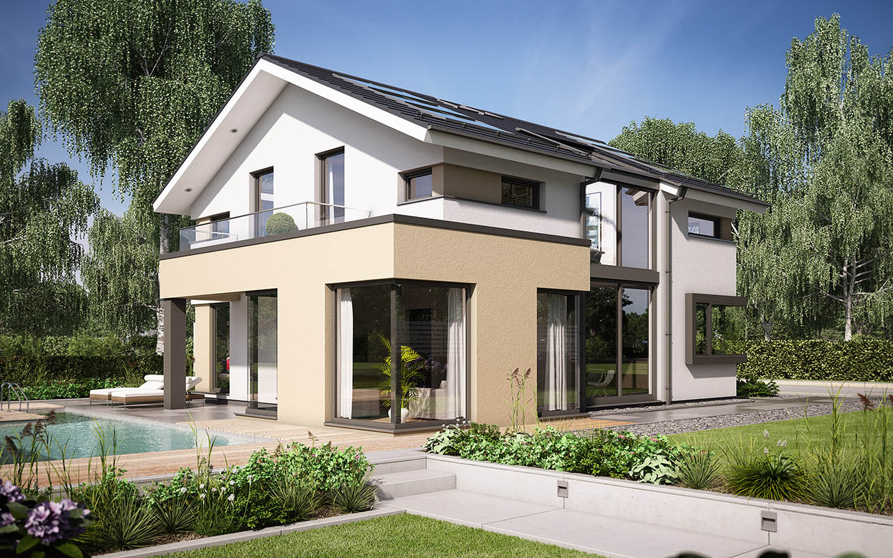 The Evolution Fellbach prefabricated house from Bien-Zenker is an innovative house with high quality and design and ecological aspects. The modern, representative single-family-house design features a high amount of glass in the façade’s design. Highlights are the round joint windows, the design corner window and the glass design entrance element as well as the XL glazing of the staircase and the LXL glass façade Light control systems in the roof make sure that the upper floor is fully illuminated with daylight. The Evolution Fellbach opens up the Plus-Energy area of Bien Zenker at a reasonable price. The energy for the Energy-Plus heat pump is completely provided by a photovoltaic system on the roof. A building management system creates a high comfort of living and saves additional energy. The Thermo-Wall+ takes care of an optimized heat damming and noise protection. With these features, the Evolution Fellbach house fulfils the