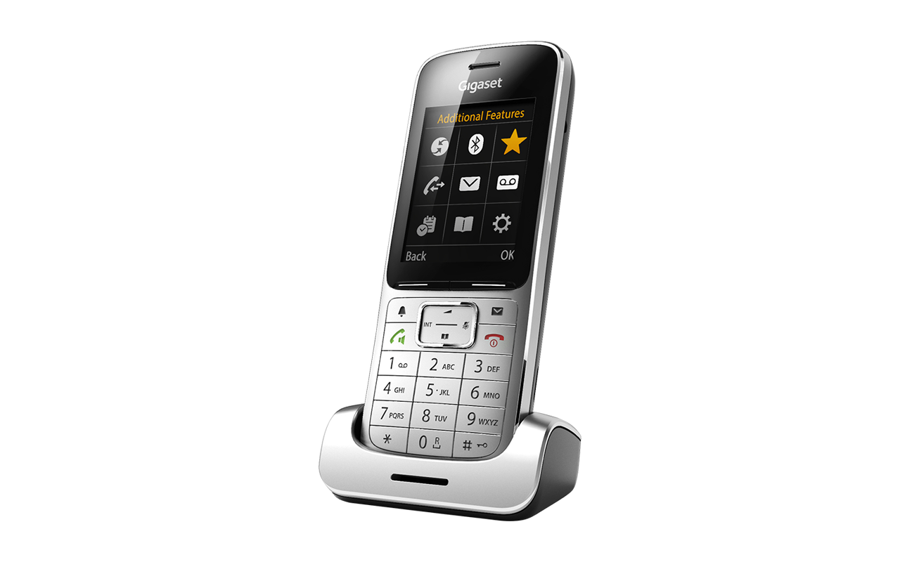Being the latest model of the high-end series, the Gigaset SL450 stands all tricks of elaborate telephone manufacturing. This already starts with its design: aluminium on the outside on a zinc die cast frame –a guarantee for stability even if you sit on it. The large colour display shows an easy to use operating system with professional functions – conferences, navigation and a sensor-supported monitoring system are ready for any scenario.