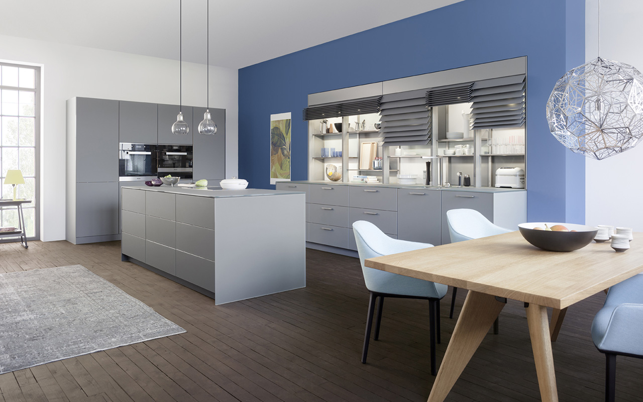 The kitchen equipment “Xtend+ Lichtregal” (light shelf) from LEICHT means a completely new orientation of the whole kitchen architecture towards open, illuminated shelfs. Thanks to the harness mechanism integrated in the rack, a nearly complete opening of the face blades is possible. The face blades are operated electrically by the remote control. The shelves, which are illuminated one by one by a wireless power supply, can be adjusted in height. The high quality is visible by the use of wood components with the load-carrying aluminium parts. The shelves are delivered in a completely mounted stated, ready for “plug & play”. The blades in front of the light shelf create a piece of furniture that looks very light; the brushed, anodised aliminium profiles form the contours of the shelf. Opened, it shines as a highlight and living work centre in the kitchen; closed, it gives a quited, well-sorted image by its horizontal lines. All shelves are easy to access and use, because the fronts open up the whole useable space and retract upwards out of the gripping area.