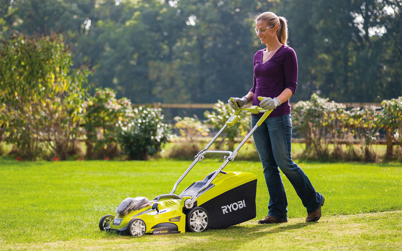 The RLM18X40H240 by Ryobi can handle up to 550 sqm with only one charging of the battery. This device offers an additional advantage: Instead of the usual equipment with one 36 volt battery the machine is equipped with two 18 volt lithium ion batteries from the Ryobi ONE+ system. They match with more than 35 further electronic and gardening tools of the manufacturer. Thus, both energy storages can be used for numerous other tasks while the lawn mower waits for its next turn. This saves money and resources. Additional 18 volt ONE+ devices can be bought without charger and battery. The eye-catcher of the device is the height-adjustable handle with ergonomic grips and additional bar ends. They create a relaxed hand position and a better, more precise handling of the machine. The frame is equipped with quick release fasteners and can thus be folded and unfolded instantly.