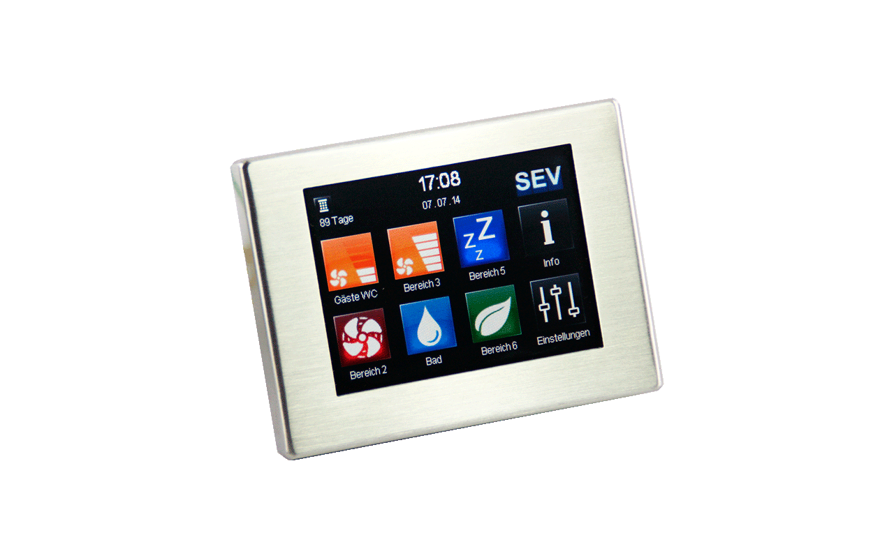 The SEC-Touch from SEVentilation allows an „individual“ control in pairs of up to 12 fan drives with six ventilation levels each. No matter if you choose intermittent ventilation, a time program with up to 5 switching times or the snooze function, with the 3.5’’ multicolor TFT touch control element this is easily possible. It also automatically counts the hours of operation and warns well in time if a filter replacement is needed.