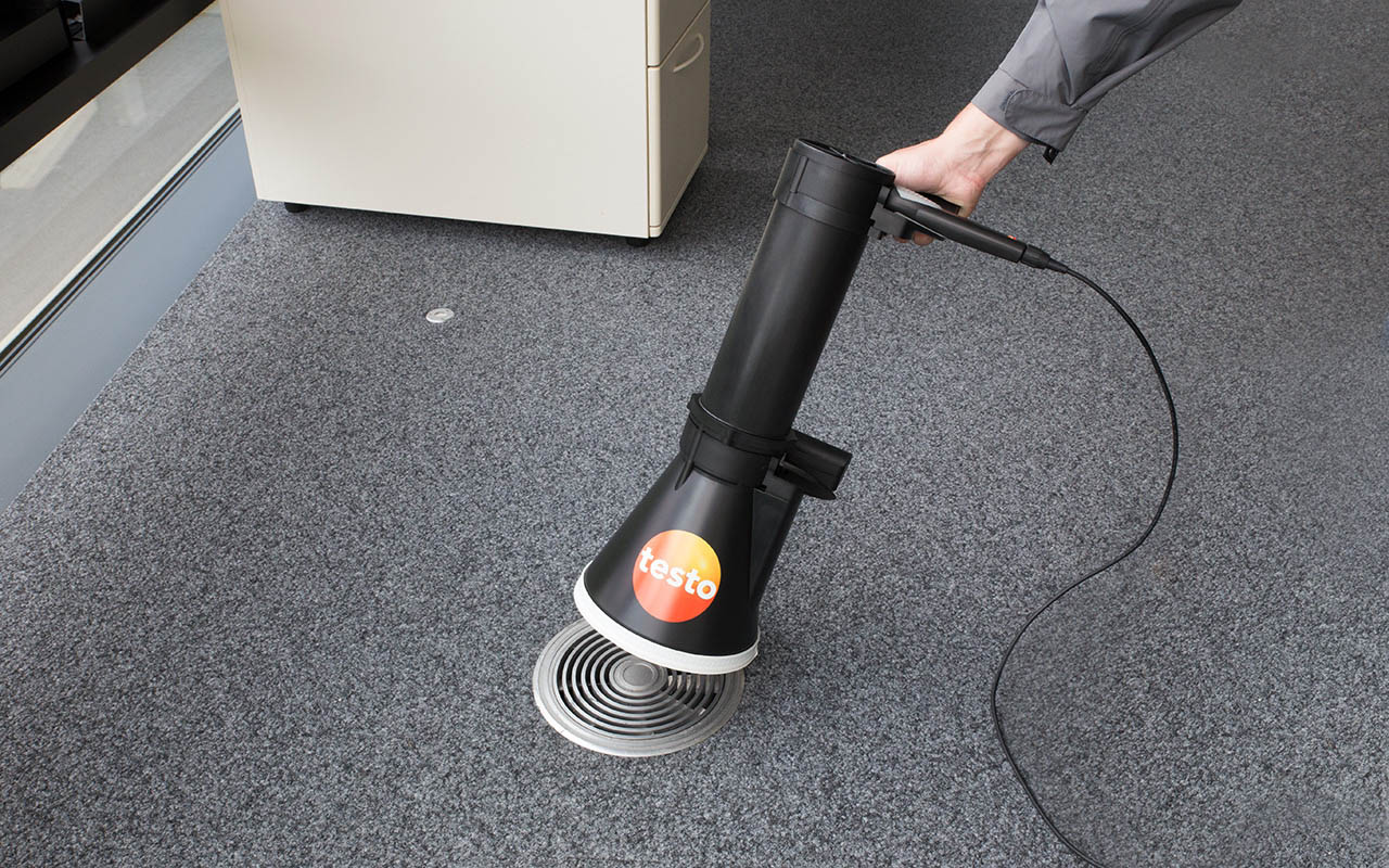 The innovative volumetric flow rectifier testovent 417 from Testo perfectly supports the measurement of the flow at ceiling diffusors. The volumetric flow rectifier changes the swirled flow into a nearly equal flow, which can subsequently be captured reliably with an impeller anemometer or vane probes. The measurement at ceiling diffusers leads to lower or higher results depending on the flow direction. The volumetric flow rectifier can be used in combination with the optional measuring funnel testovent 417 and the optinal impeller anemometer testo 417 or the vane probes (Ø 100 mm) of the testo 435 and testo 480.