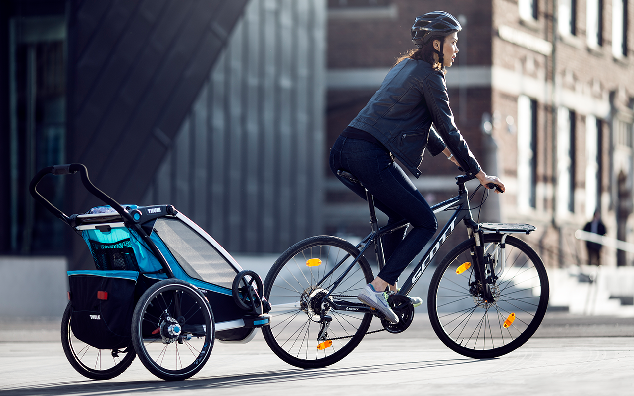 The Chariot Sport bicycle trailer from Thule scores with high quality, ease of use and functionality. Its high quality is visible in the manufacturing of the metal parts as well as in the fabrics. All parts that require an interaction of the user with the trailer are marked clearly in the typical Thule-blue colour and are thus self-explanatory. Accessories can be easily attached using Plug & Play. Handling is easy, the Chariot Sport 2 can be quickly folded away to a compact measurement. Many functions create comfort in the trailer, among them the adaptable lounge seats and the air-conditioned interior space. Disk brakes guarantee a secure braking, no matter if the Chariot Sport is used as bicycle trailer, buggy or jogger.