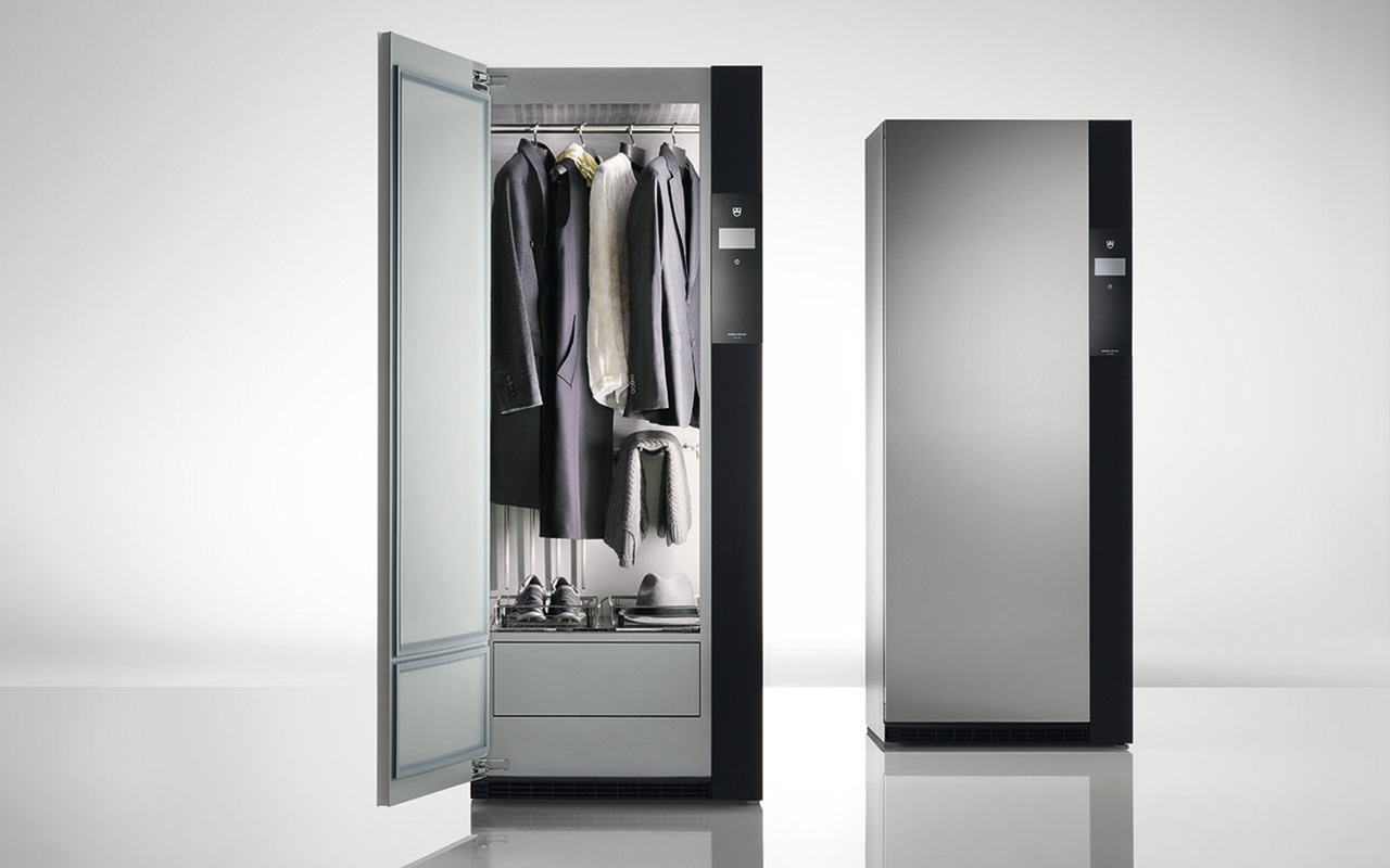 The Refresh Butler is like dry-cleaning at home. The elegant floor-standing device combines four functions: The Refresh-Function with the world innovation photocatalysis neutralises cooking and fat odours and cigarette smoke by using vapour, freeing clothes from odours. Wrinkles from suits, dresses, blouses and shirts are visibly reduced. If you choose the additional programme “sanitise”, the Refresh Butler removes germ nearly completely. The drying function takes care of rain-slicked clothes in a careful and energy-saving (thanks to the heat pump) way.