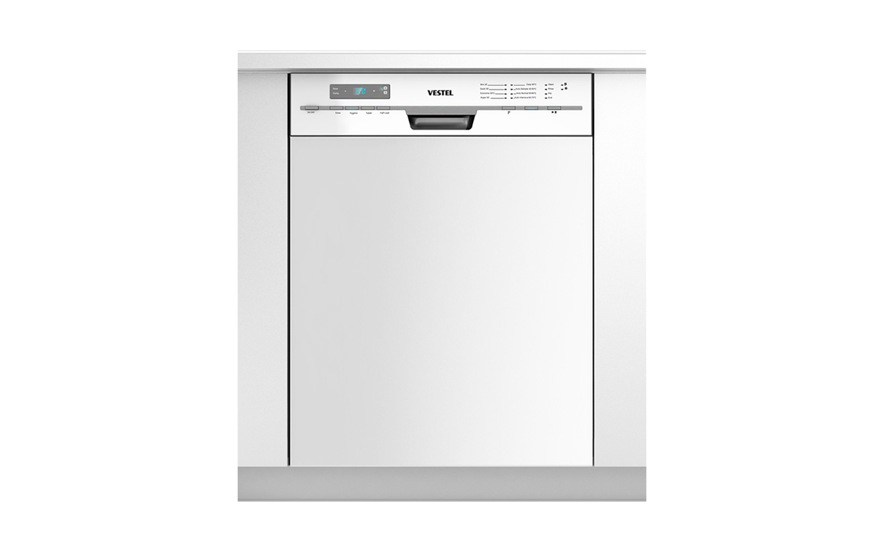 With the Amaranth dishwasher, Vestel offers a product, which convinces with high quality, design and ease of use. The half-integrated dishwasher is 60 cm wide and can hold 12 covers. The minimalistic design is underlined by the slim, horizontal elevation. It runs over the front panel and holds the grip area and the operation field. Thus, the user can fully concentrate on the buttons and the information on the LED. A third cutlery basket can be placed in the upper basket. When loading, the height of the mid basket can be adapted. Foldable trays help to position the mid and lower basket, resulting in a high flexibility for loading the dishwasher.