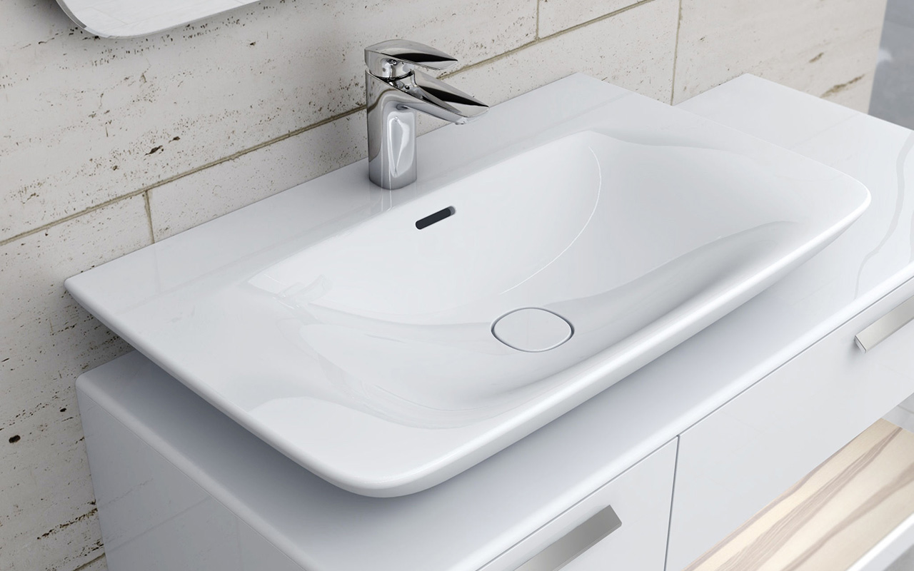 The Vigour White bathroom collection of washbasin, valve and bathroom furniture feature a high quality and a professional industrial design. With the collection, Vigour has created a timeless product with a high comfort. Only high quality, long lasting products are used – quality “Made in Germany”. The design of the White bathroom collection follows the trend for soft, organic forms. The softly floating inner surfaces of the washbasin imitate the natural forms of a washed-out stone. Thanks to its very flat design, the washbasin looks light and elegant. The valve adapts to this: the high outlet creates a larger space for the hands under the valve. This harmonious design is complemented by the bathroom furniture. Here, a combination of flat, high and open storage spaces has been created. The integrated open shelf offers space for decoration and creates a living atmosphere; the same is true for the lamps which illuminate the decoration on the one hand, giving an agreeable room atmosphere on the other hand.