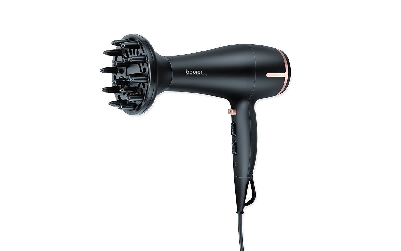 Dass man auch bei einem Haartrockner Energie sparen kann, will der Beurer HC 60 unter Beweis stellen. Beurer bescheinigt ihm nämlich bei einer Leistungsaufnahme von lediglich 1.400 Watt eine Wirkung, die einem Gerät mit fast 50 Prozent mehr „Dampf“ entspricht – 2.000 Watt. Mit zur Einsparung von Energie, wenn auch in viel geringerem Umfang, kann auch der Berührungssensor beitragen: Er schaltet den Haartrockner ein und aus, wenn man ihn bei eingeschalteter Gebläsestufe berührt – oder eben nicht. Dazu gibt es eine Kaltstufe zur Fixierung des Stylings, drei Heiz- und zwei Gebläsestufen. Unter der Soft-Touch-Oberfläche hat Beurer auch eine Ionisierungsfunktion integriert.