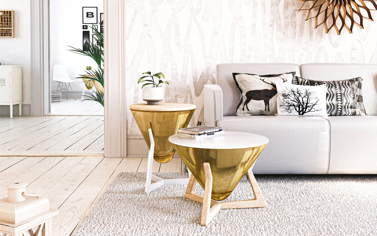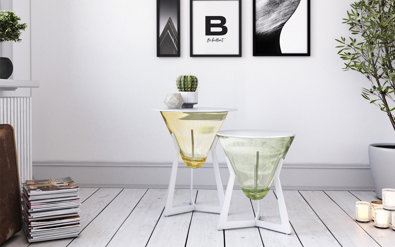 Die Tischkollektion Brillant von Aguti Design zeichnet sich durch ihre Flexibilität in der individuellen Gestaltung aus. Jeder Tisch besteht aus einer Basis, einem Glaskegel und der Tischplatte. Aus diesen Elementen kann jeder Käufer sein individuelles Modell zusammenstellen. Drei verschiedene Höhen und drei verschiedene Durchmesser stehen als Ausgangsbasis zur Verfügung. Für die Tischplatte stehen vier hochwertige Materialvarianten von Massivholz Eiche hell bis zu geschliffenem Jura-Schiefer zur Verfügung. Der Glaskegel ist in sechs Trendfarben, darunter Topaz und Amethyst erhältlich. Die Basis, die den Tisch trägt, ergänzt mit fünf Farbvarianten, wahlweise in Eiche massiv oder beschichtetem Metall die Vielfalt. So passt jeder Brillant-Tisch zum individuellen Wohnstil seines Besitzers.