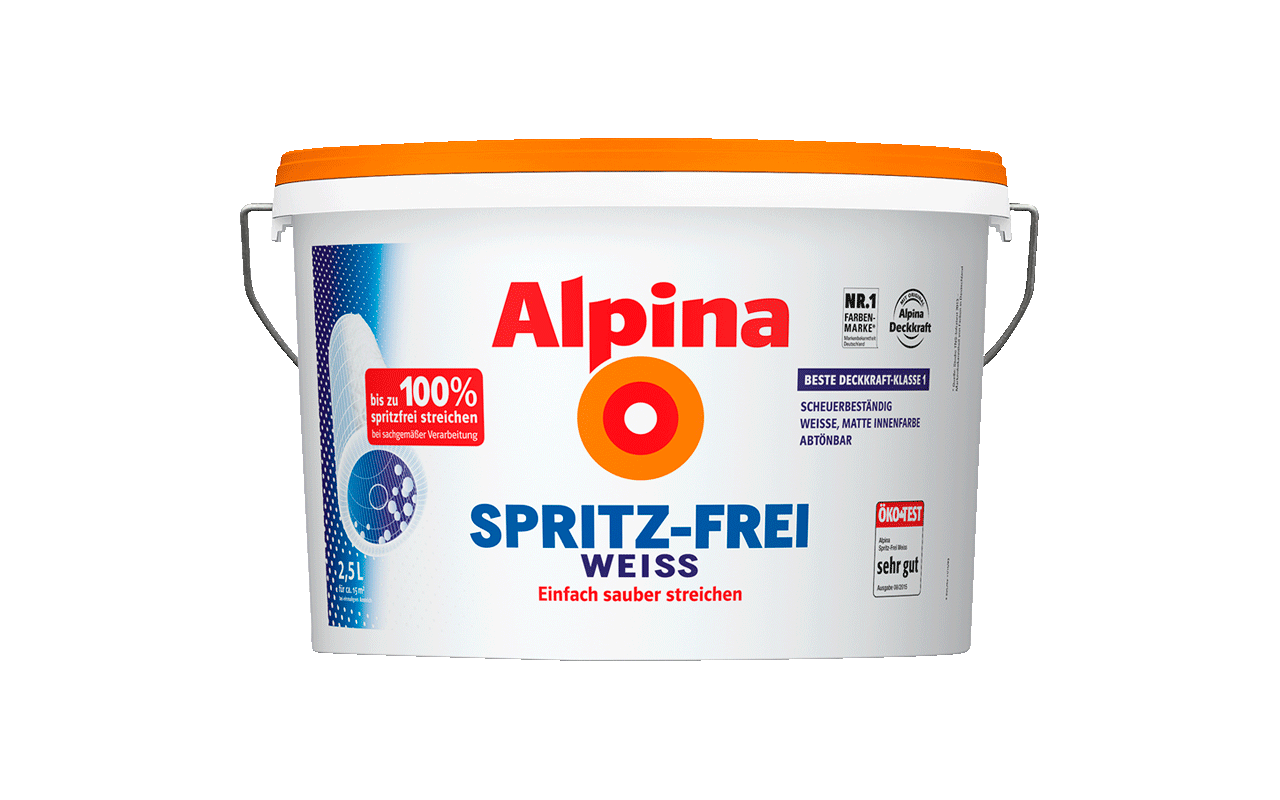 Die meisten Heimanwender stören sich an den üblichen Farbspritzern und Tropfen. Alpina hat mit einer neuen Dispersionsfarbe die Lösung dagegen gefunden: Alpina Spritz-Frei Weiß ermöglicht ein bis zu 100-prozentig spritzfreies Streichen. Heimwerker bleiben damit sauber und können lästige Abdeck- und Reinigungsarbeiten auf ein Minimum reduzieren. Eine innovative Rezeptur mit speziellen Additiven ermöglicht die neue Spritzfreiheit: Sie optimieren die Konsistenz der Farbe so, dass diese perfekt an der Rolle haftet und somit die Spritzneigung reduziert wird. Dies bezeichnen die Alpina Produktentwickler plakativ als „Kaugummi“-Effekt. Das Besondere dabei: Alpina Spritz-Frei Weiß lässt sich dennoch mühelos auf Wände sowie Decken übertragen und verteilen.