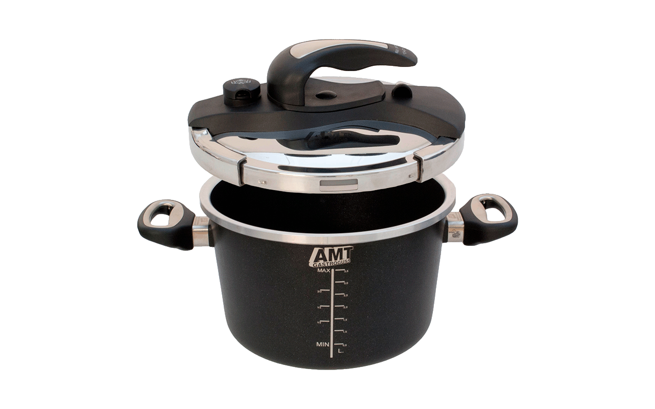 Der Aluminium-Guss-Körper des AMT Schnellkochtopfes ermöglicht beste Wärmeverteilung und schnelles Erhitzen. Die „Lotan“-Oberflächenversiegelung verhindert dabei Anhaften beim Anbraten, Schmoren oder Auftauen. Durch die Verwendung des Glasdeckels kann der AMT Schnellkochtopf auch als Standard-Kochtopf verwendet und Gerichte auch auf herkömmliche Art zubereitet werden