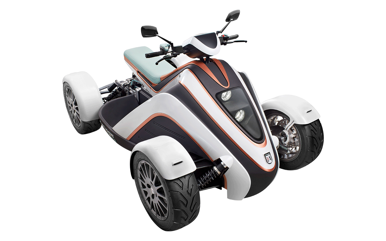 Das Elektroquad Artega Karo soll nicht einfach nur Spaß machen, auch wenn der Fahrspaß bei dieser serienreifen Konzeptstudie sicher im Vordergrund steht. Ein Fahrwerk mit Technologien aus dem Rennsport und das herausnehmbare Soundmodul mit Bluetooth-Anbindung zum Smartphone sprechen eine deutliche Sprache, die von einem Drehmoment von 100 Nm bei 320 Kilogramm Gewicht nur unterstützt wird. Mit dem Artega Karo könnte man ohne weiteres auch den täglichen Weg zur Arbeit zurücklegen, denn wie bei einem Roller – oder eleganter: Scooter – sind die Beine durch breite Schilde vor aufwirbelnden Steinen oder Gischt nach einem Regenguss geschützt. Aufgeladen werden die Akkus nach bis zu 80 Kilometern an einer ganz normalen Steckdose. Das dauert zwar etwa zweieinhalb Stunden, bringt aber keine Steckdosen- oder Absicherungsprobleme mit sich. Das Artega Karo gibt es mit drei verschiedenen Leistungsstufen bis 45, 85 oder 105 km/h.