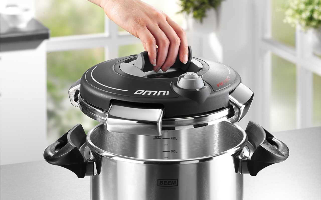 Beem bietet mit dem „OMNI PERFECT“ die praktische Einhandbedienung. Der Deckel des Schnellkochtopfes kann mit einer Hand geöffnet und geschlossen werden. Zudem ermöglicht der abgerundete Rand des Topfes ein leichtes und sauberes Abgießen. Der aus Edelstahl bestehende Korpus ist leicht zu reinigen und zudem spülmaschinengeeignet.