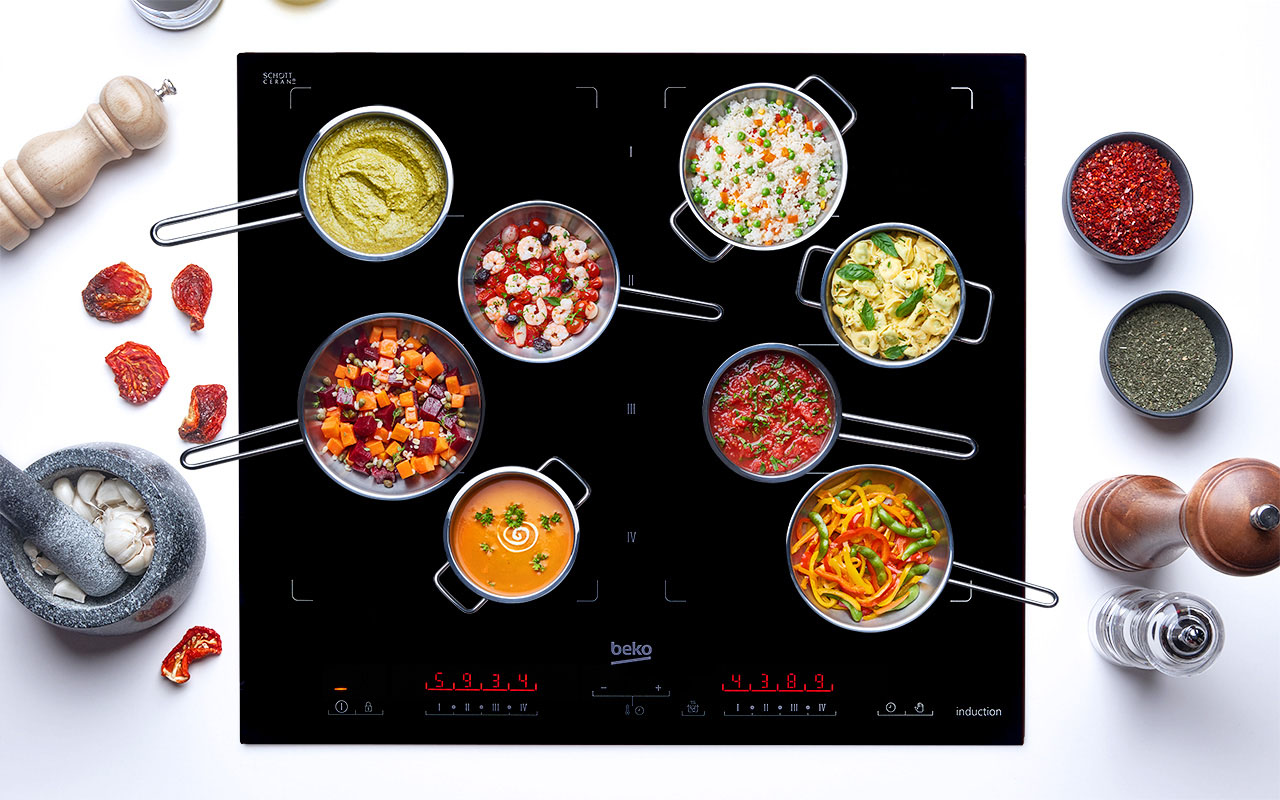 Flexibel wie kaum ein anders Induktionskochfeld lässt sich das Beko HII68600 PTX nutzen. Äußerlich wirkt es mit Sensortouch-Bedienungn und der schwarzen Glaskeramikoberfläche zwar wie jedes andere Induktionskochfeld, bei dem die Hitze direkt in den Topfböden entsteht, doch seine beiden Kochzonenhälften sind ganz anders strukturiert als die anderer Geräte seiner Klasse. Jede Hälfte besteht aus vier Kochzonen, die in unterschiedlichen Kombinationen zusaammengeschaltet werden können. So können zwischen zwei großen Brätern und acht kleinen Töpfen alle möglichen Topfvariationen mit unterschiedlichen Temperaturen versorgt werden. Dabei steht auf jeder der Kochstellen eine Leistung von bis zu 2,5 kW zur Verfügung – auf jeder Seite also insgesamt 5 kW. Jede Kochzone lässt sich in 18 Stufen regulieren, und Kindersicherung, Restwärmeanzeige und Topferkennung sorgen für Sicherheit.