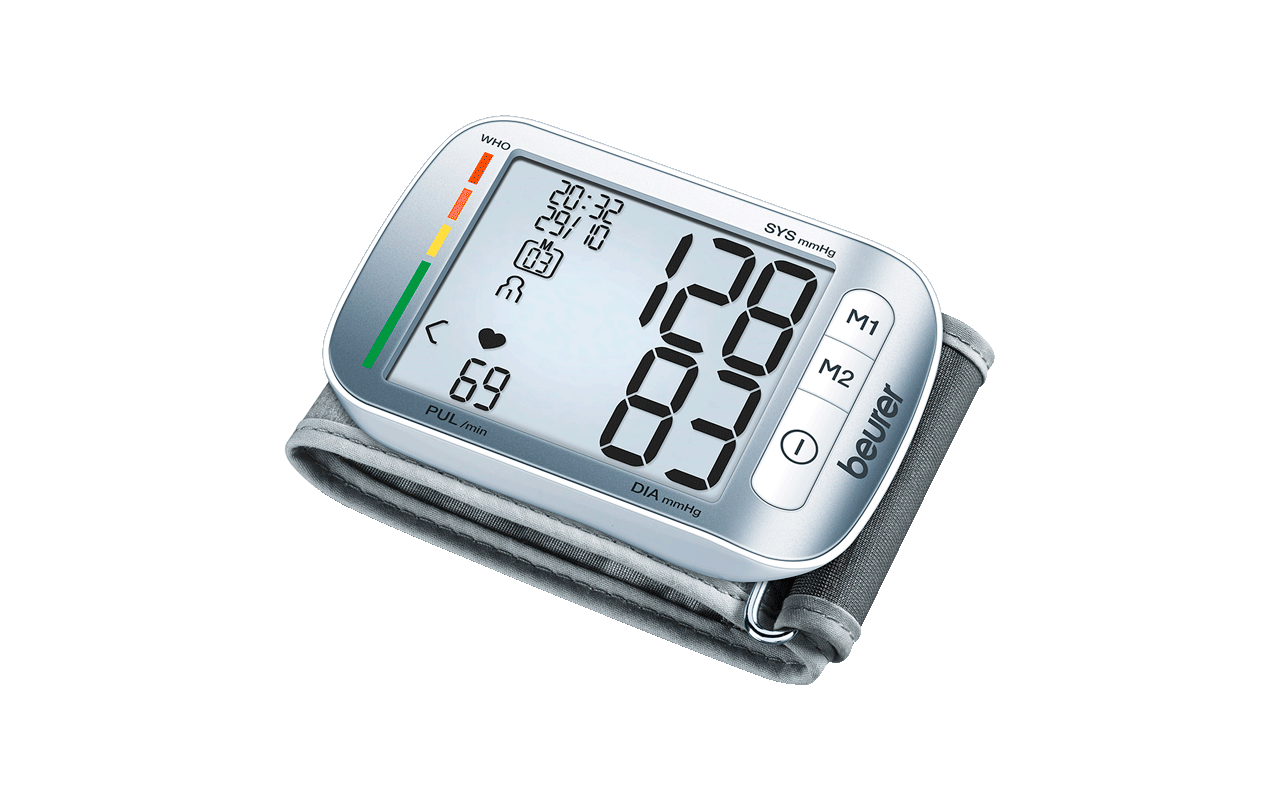 Das Blutdruckmessgerät BC 50 von Beurer erlaubt die vollautomatische, bequeme Blutdruck- und Pulsmessung am Handgelenk. Beim BC 50 schafft die hohe Qualität, gepaart mit Design, Bedienkomfort und Funktionalität ein verlässliches Medizinprodukt zur Überwachung von wichtigen gesundheitlichen Elementen zu hause. Auffällige Designelemente sind das große, leicht ablesbare Display und das extra flache Design. Das silberfarbene Gehäuse bietet ein elegantes, schlichtes Design. Die Manschette ist für Handgelenksumfänge von 13,5 bis 23 cm geeignet. Drei Bedienknöpfe bieten die komfortable Handhabung aller Funktionen. Die Werte werden anhand der farbigen WHO-Skala eingeordnet und geben an, in welchem Bereich sich der ermittelt Blutdruck bewegt. Neben zweimal 60 Speicherplätzen zeigt das BC 50 den Durchschnittswerte aller gespeicherten Messwerte sowie Morgen- und Abendblutdruck der letzten sieben Tage an. Außerdem verfügt es über eine Arrythmie-Erkennung und warnt so durch ein entsprechendes Symbol vor eventuellen Herzrhythmusstörungen. Eine integrierte Abschaltautomatik sowie eine Meldung bei Anwendungsfehlern machen den Gebrauch des Beurer BC 50 noch zuverlässiger. Das Gerät ist batteriebetrieben und wird mit einer praktischen Aufbewahrungsbox ausgeliefert.