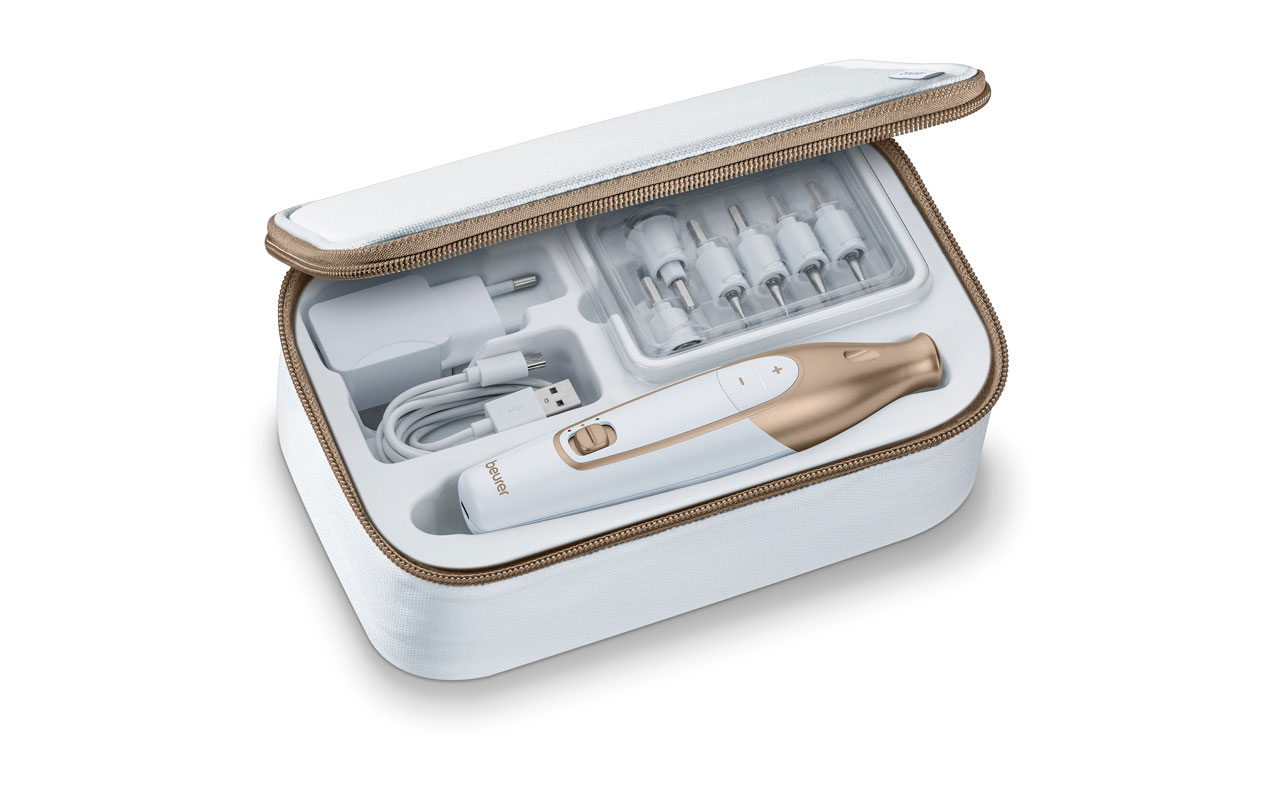 Das Maniküreset MP 64 von Beurer bietet eine hochwertige Ausstattung zur professionellen Komplettpflege von Hand- und Fußnägeln. 10 Aufsätze dienen zur Unterstützung der verschiedenen Arbeitsschritte. Zusammen mit der dreistufigen Geschwindigkeitsregelung und dem Rechts-/Linkslauf wird eine Fuß- und Nagelpflege für zuhause in einer Qualität möglich, wie sie sonst nur im professionellen Studio passiert. Der leistungsstarke Lithium-Ionen-Akku erlaubt eine Betriebszeit von bis zu zwei Stunden.
