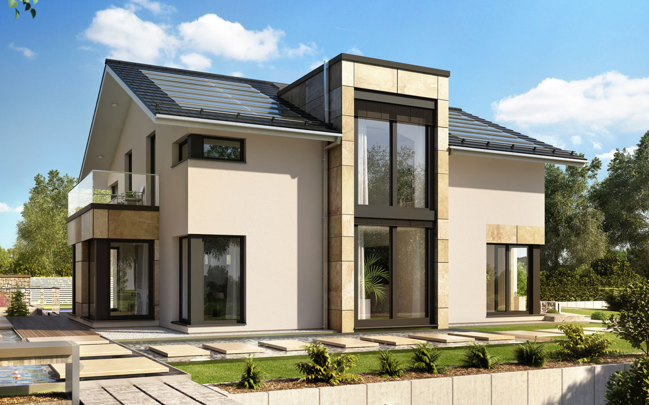 Das Concept-M 163 München Fertighaus von Bien-Zenker fällt durch seinen glasumrandeten „Terrassen-Balkon“ außen und die lebendige Wasserwand im Innern auf. Für das Haus wurden ausschließlich hochwertige Baustoffe verarbeitet. Die offene Küche mit Speisekammer, das großzügige Dusch-WC und ein separates Arbeitszimmer im Erdgeschoss belegen die Funktionalität ebenso wie die Bäderlandschaft mit Sauna und den Balkonen im Dachgeschoss. Auch in Sachen Ökologie überzeugt das Concept-M 163 München: Es wurde mit dem DGNB-Zertifikat Platin ausgezeichnet.
