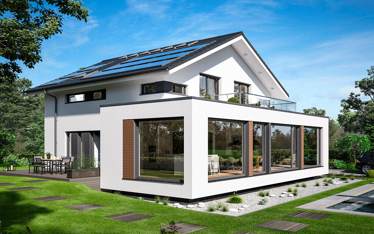 Mit dem CONCEPT-M 210, dem Musterhaus Günzburg, kann Bien-Zenker auf voller Linie überzeugen – und punktet in den Kategorien Innovation, hohe Qualität, Design, Bedienkomfort, Funktionalität und Ökologie. Die Innovation zeigt sich auf den ersten Blick: Ein Glaskubus, der vor das Haus gesetzt wurde und das Erdgeschoß erweitert. Auf dem Kubus sitzt ein großzügig geschnittener Balkon. Damit entsteht eine Verbindung zwischen der klassischen Form des Hauses und dem ungewöhnlichen Look des Kubus. Eine weitere Verbindung schaffen die großen Glasflächen in beiden Teilen. Der Bedienkomfort entsteht durch die Gebäudeautomation, in die alle Steuerungselemente eingebunden sind. Dazu gehört auch die Sicherheitstechnik und die Energiespeicherung des KfW40 Effizienzhauses. Die Gestaltung des Grundrisses ist funktional und barrierearm. Ein Wellnessbad mit Sauna und zwei separate Ankleidezimmer repräsentieren – neben anderen Elementen – die Hochwertigkeit des Hauses.