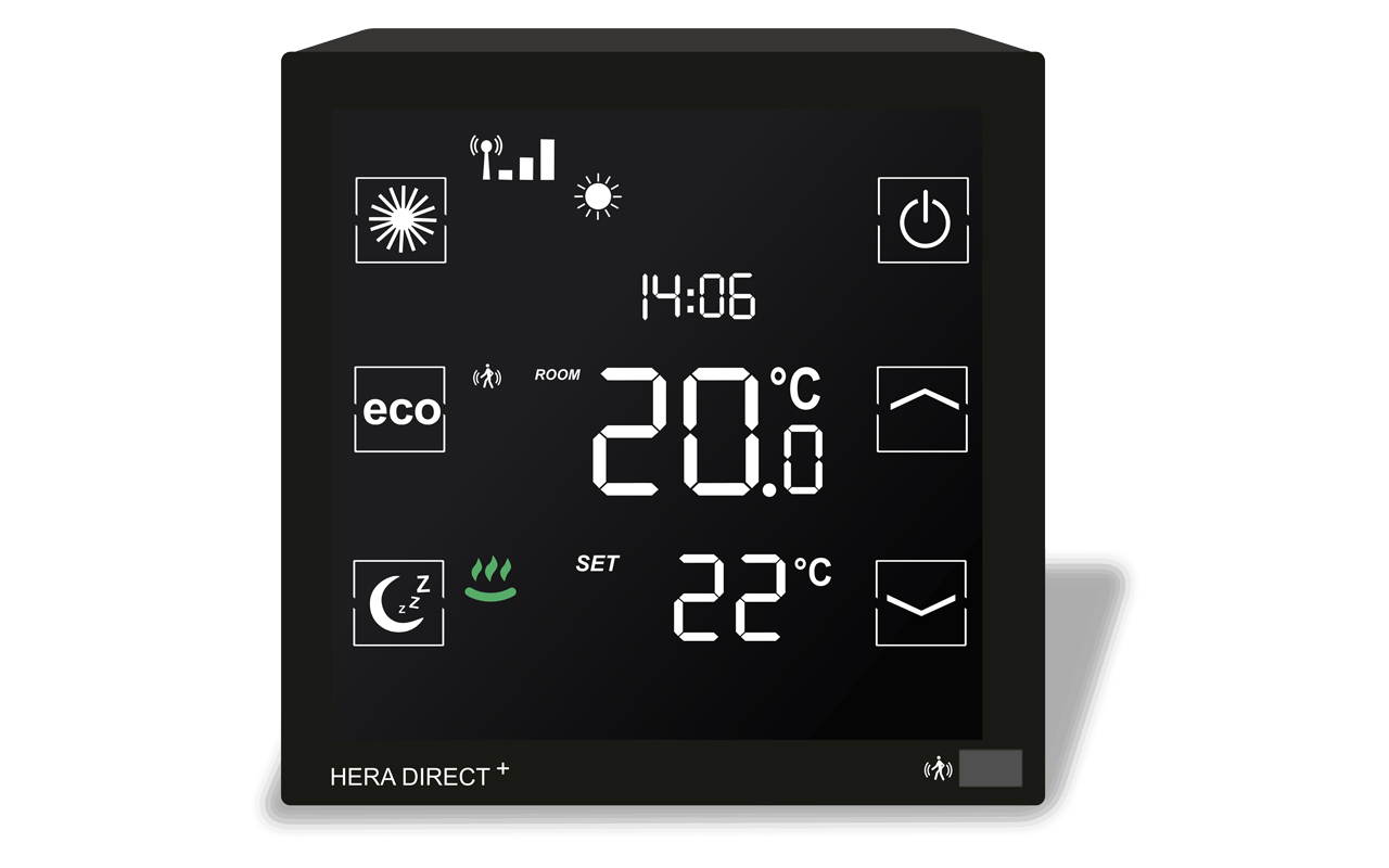 Das Unterputz-Raumthermostat Hera Direct+ von Blossom kann auf zwei Arten verwendet werden: In Kombination mit den Hera+ Funk-Fußbodenheizungsleisten Hera+ Primus / Hera+ Extensia und den Hera+ Aktoren und zur Steuerung herkömmlicher Stellantriebe direkt verdrahtet. Das Thermostat wird über ein beleuchtetes Touchscreen-Display gesteuert, das über eine automatische Nachtabblendung verfügt. Es ist mit Bewegungssensoren und einer Fensteröffnungserkennung ausgestattet. Das Thermostat kann neben dem Display auch über die blossomic-App von unterwegs gesteuert werden.