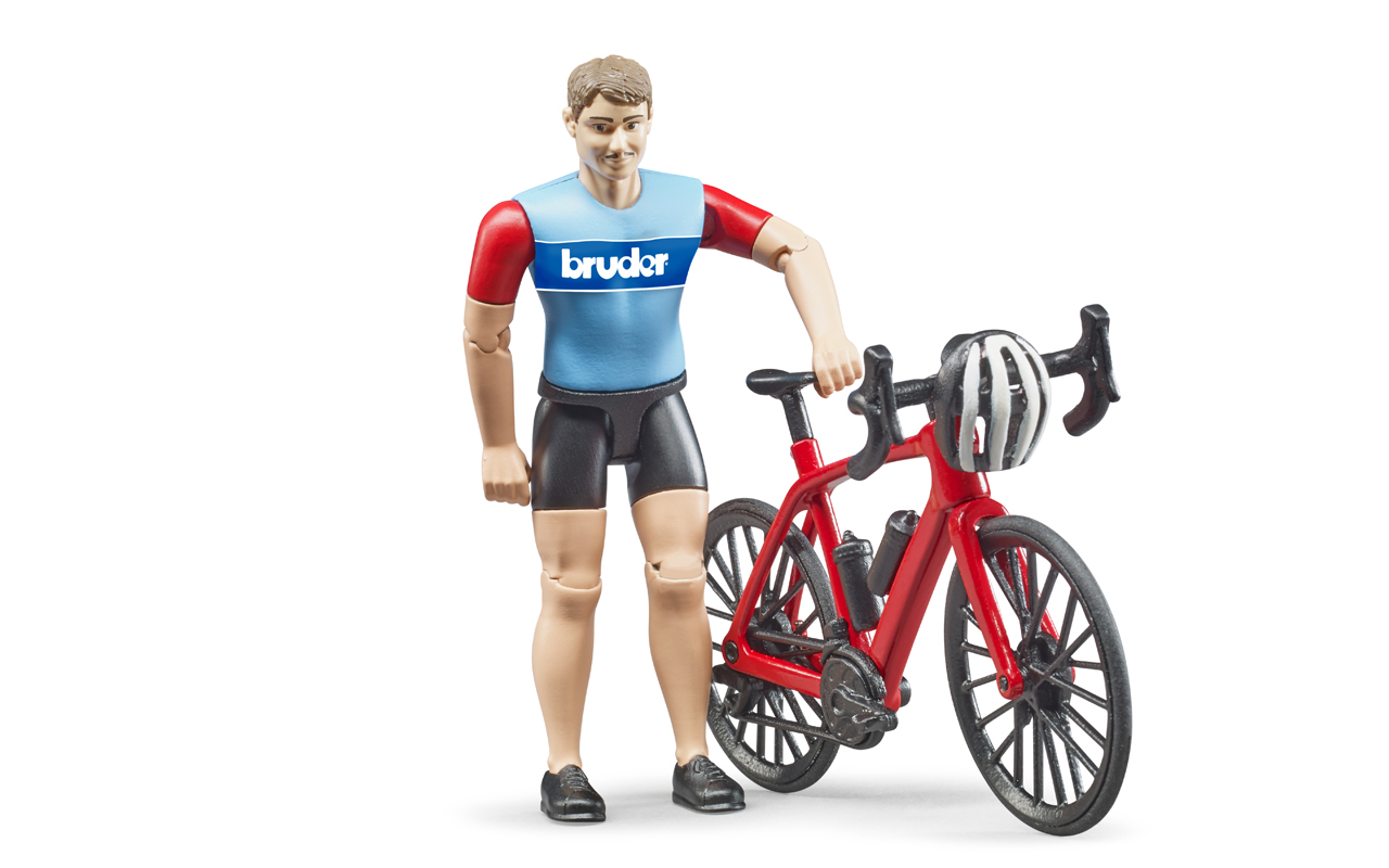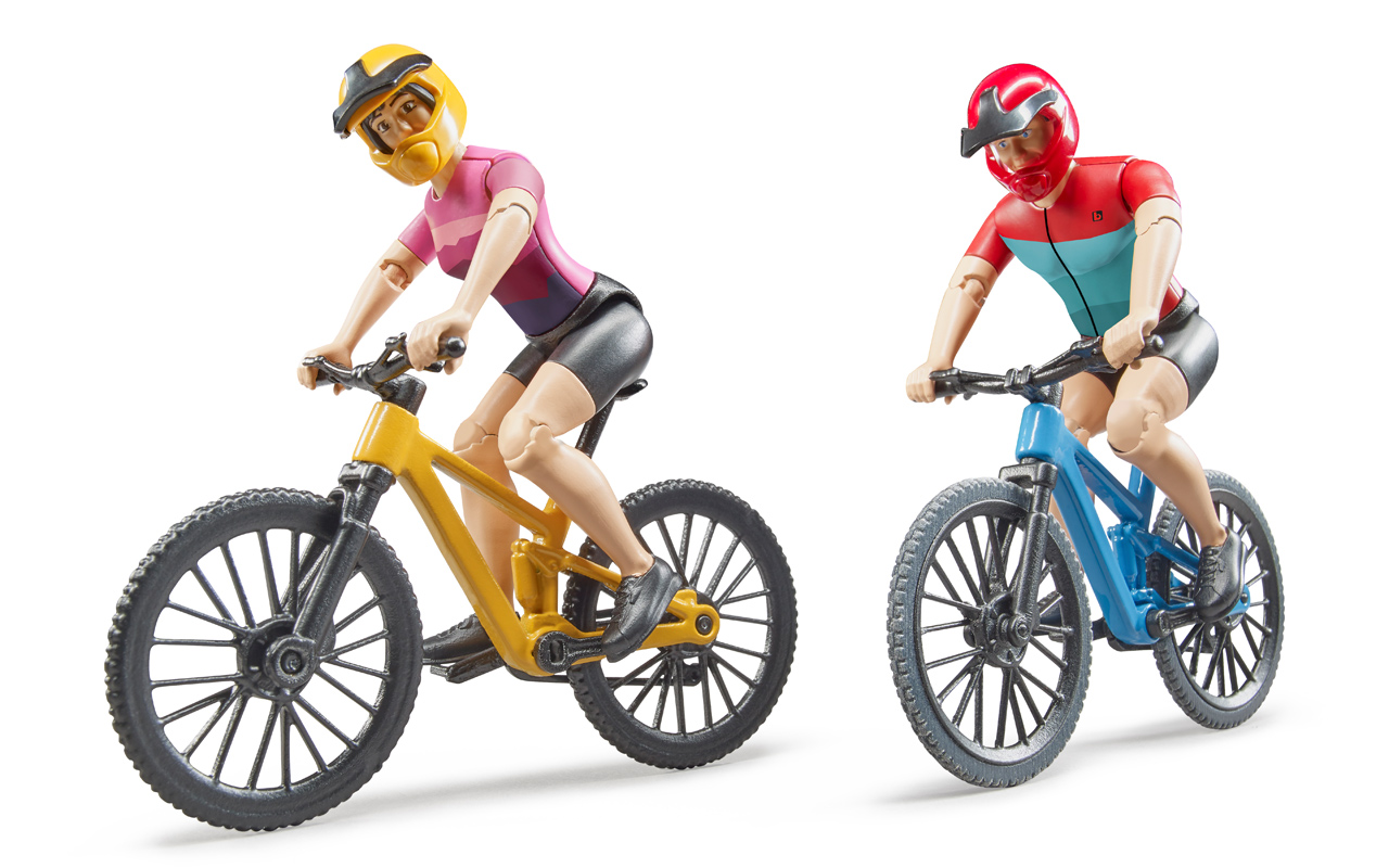 Mit den neuen Figuren der bworld Serie präsentiert Bruder einen Radfahrer und eine Radfahrerin, die voll im Trend liegen. Mit Rennrad bzw. Mountainbike ausgestattet, sind die Figuren – wie bei Bruder üblich – so nah wie möglich an der Realität orientiert und detailgetreu gefertigt. Die Räder sind lenkbar, die Gelenke und der Kopf der Figuren beweglich, die Hände können an den Lenker angepasst werden. Die hohe Qualität zeigt in Material und Fertigung. So werden die Kunststoffteile direkt im Spritzgieß-Prozess eingefärbt und sorgen so für eine lange Haltbarkeit der Farben. In Kombination mit anderen Bruder-Produkten, beispielsweise Autos mit passendem Fahrradanhänger, steht dem trendigen Spielspaß nichts mehr im Weg.