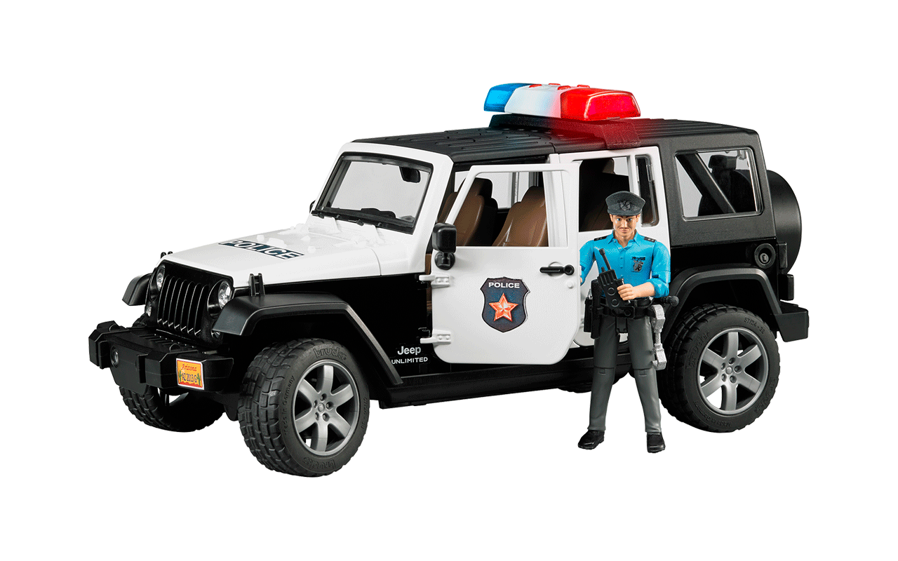 Durch die hochpräzise Kunststofffertigung und mittels des Mehrkomponenten-Spritzgießens entstehen qualitativ hochwertige Teile, die einen langen und intensiven Spielbetrieb überstehen. Das Einfärben der Kunststoffteile entsteht direkt im Spritzgußprozess für eine dauerhafte Qualität der Farbgebung. Die zahlreichen Spielfunktionen in Verbindung mit hoher Stabilität führen zu Anpassungen des vorgegebenen Designs, das im Hinblick auch das originalgetreue Äußere möglichst nicht erkannt werden soll. Bei dem BRUDER Spielfahrzeug „02526 Jeep Wrangler Unlimited Rubicon Polizeifahrzeug mit Polizist und Accessories“ sorgt eine Lenkradverlängerung für gesteigerten Bedienkomfort beim Lenken des Fahrzeugs. Das Spielfahrzeug verfügt über gefederte Achsen mit Profilreifen, das Dach ist zweiteilig abnehmbar, die Motorhaube, Heckscheibe und die 5 Türen sind zum Öffnen, die Rücksitzbank ist herausnehmbar. Das Light & Soundmodul auf dem Dach ist mit 4 Funktionsknöpfen ausgestattet und kann abgenommen werden.