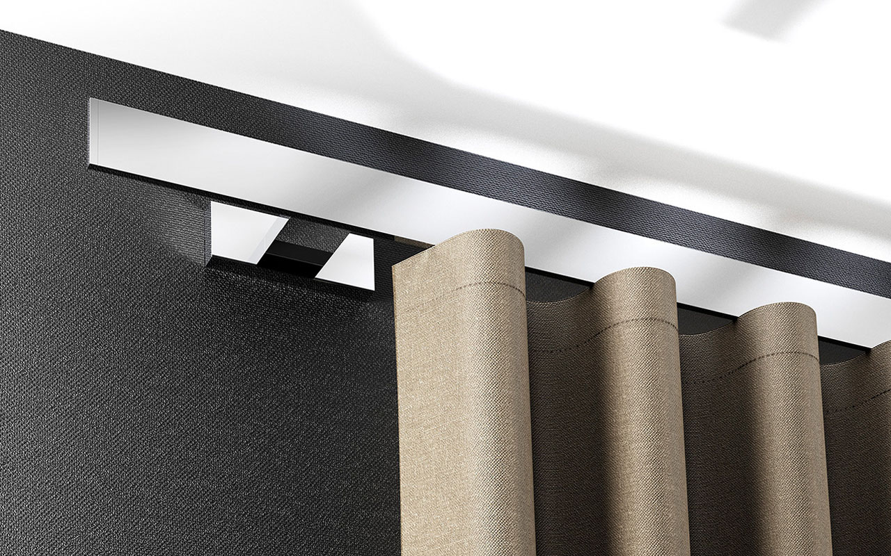Das „Slim“-System zur Vorhangbefestigung aus dem Hause Buchheister bietet hohe Qualität, überzeugendes Design und eine ausgezeichnete Funktionalität. Entworfen vom Berliner Designer Jochen Schmidden ist die Blende auf ein sehr schmales Format reduziert. Das System wurde speziell für Wellenvorhänge entwickelt und ist in verschiedenen Edelstahl-Varianten erhältlich. Die Bauweise der Gleiterkette sorgt dafür, dass die Vorhänge gleichmäßig laufen und sich nicht verhaken. Die Befestigung ist modular aufgebaut: Die Blende ist losgelöst von Schiene und Trägerwerk. Damit kann sie auch nachträglich einfach ausgetauscht werden ohne die komplette Befestigung zu ersetzen.