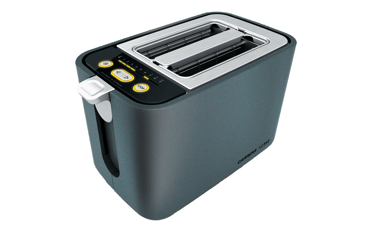 Als einer der ersten Toaster arbeitet der Carrera Quarz Toaster No. 552 nicht mit Heizdrähten, sondern mit vier Quarzröhren. Diese können in neun durch LEDs auf der Oberseite angezeigten Stufen aufgeheizt werden, um den gewünschten Röstgrad zu erreichen. Der ist durch eine automatische Brotzentrierung und die gute Wärmeisolierung überall gleichmäßig. Über einen Drehknopf für den Brötchenaufsatz, die integrierte Krümelschublade und eindeutige Tasten ist die Bedienung der digitalen Steuereinheit ein Kinderspiel. All das ist in das einheitliche Carrera-Familiendesign mit Anleihen an den Rennsportgenen der Marke gegossen, so dass auch ein Toaster zu einem Design-Statement in der Küche werden kann.