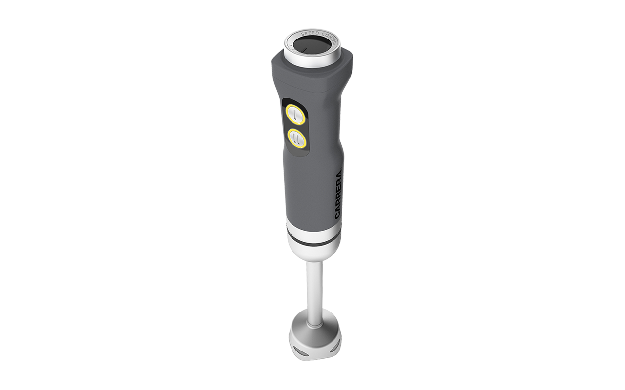Ebenfalls im Rennsport-inspirierten Design gehalten, ist der Carrera Stabmixer No. 554 ein optischer Hingucker wie auch ein kleines Technik-Schmuckstück. Mit seiner Gummierung kann er auch mit nassen Händen sicher bedient werden. Die Umdrehungsgeschwindigkeit des 800 Watt starken Antriebs kann über zwei Hauptstufen und einen fünfstufigen Feinregler ganz nach Wunsch eingestellt werden. Mit einer Softstart-Funktion vermeidet der Stabmixer ein Überlaufen des Mixgutes beim Anlaufen, und mit einer Boost-Funktion legt der Stabmixer nochmal richtig nach, wenn Lebensmittel besonders fein püriert werden sollen. Zum Saubermachen kann das Gerät direkt unter laufendes Wasser gehalten werden, das Zubehör ist spülmaschinenfest.