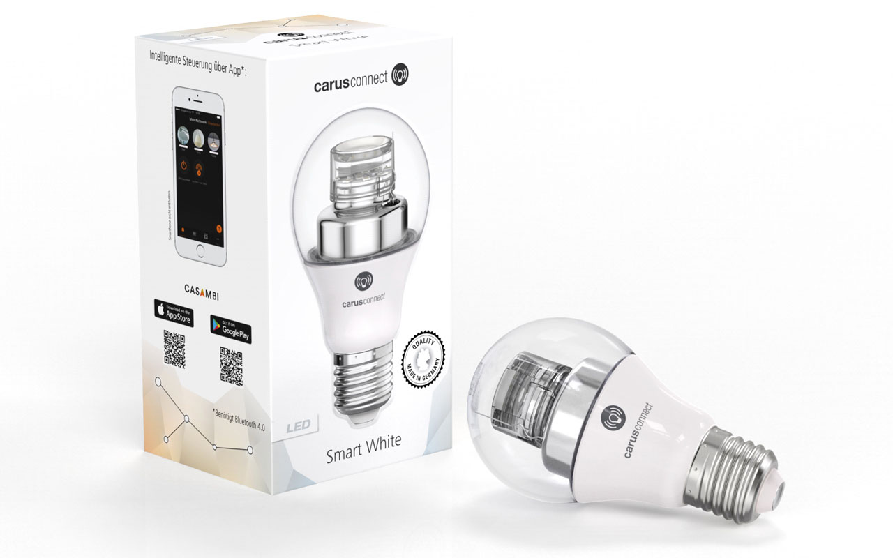 Über Bluetooth lässt sich die Tunable-White-Lampe (2.200 bis 4.500 K) Carus Connect Smart White von einem Smartphone aus ansteuern, auf dem die Casambi-App läuft. Gleichzeitig kann man sie über Wandschalter oder vom Smartphone aus dimmen.