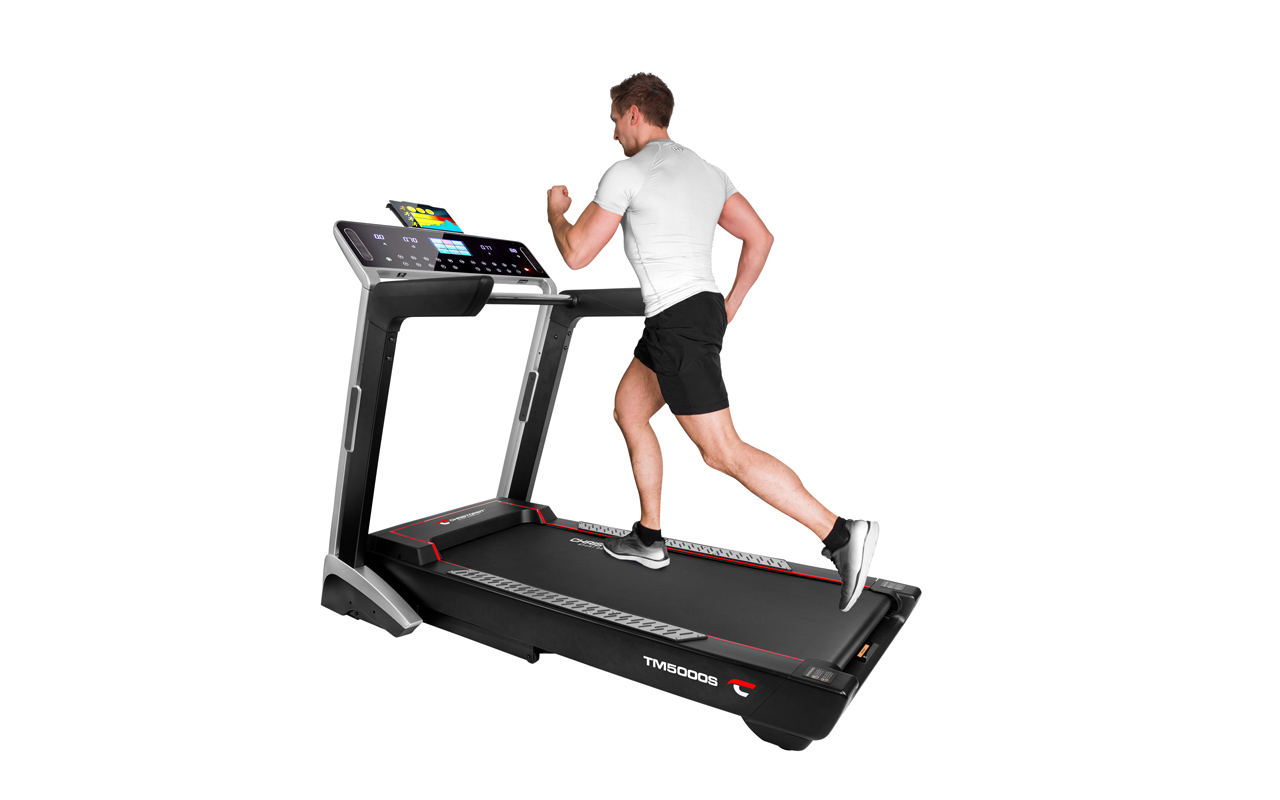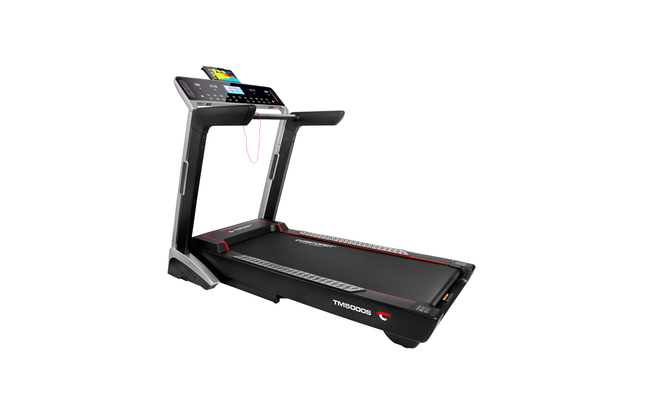 Das Christopeit Laufband TM 5000 S bietet alles, was modernes Lauftraining braucht. Neben 35 verschiedenen Programmen für Wettkampf, Ausdauer oder Herzfrequenz – darunter drei individuelle Trainingsprogramme – verfügt es über einen Computer mit einem 7-Zoll TFT-Display und leistungsstarken Entertainmentlautsprechern. Hinzu kommen Anschlussmöglichkeiten für MP3-Player und Kopfhörer und ein USB-Anschluss. Der Nutzer kann während des Trainings so seine Lieblingsmusik hören oder sogar eigene Filme anschauen. Per Bluetooth kann das TM 5000 S eine Verbindung zur Fitshow App herstellen. Das TM 5000 S lässt sich platzsparend hochklappen und kann dank der vier Transportrollen schnell an einen anderen Standort gebracht werden. Die schwingungsgedämpfte Lauffläche sorgt für gesundes Laufen.