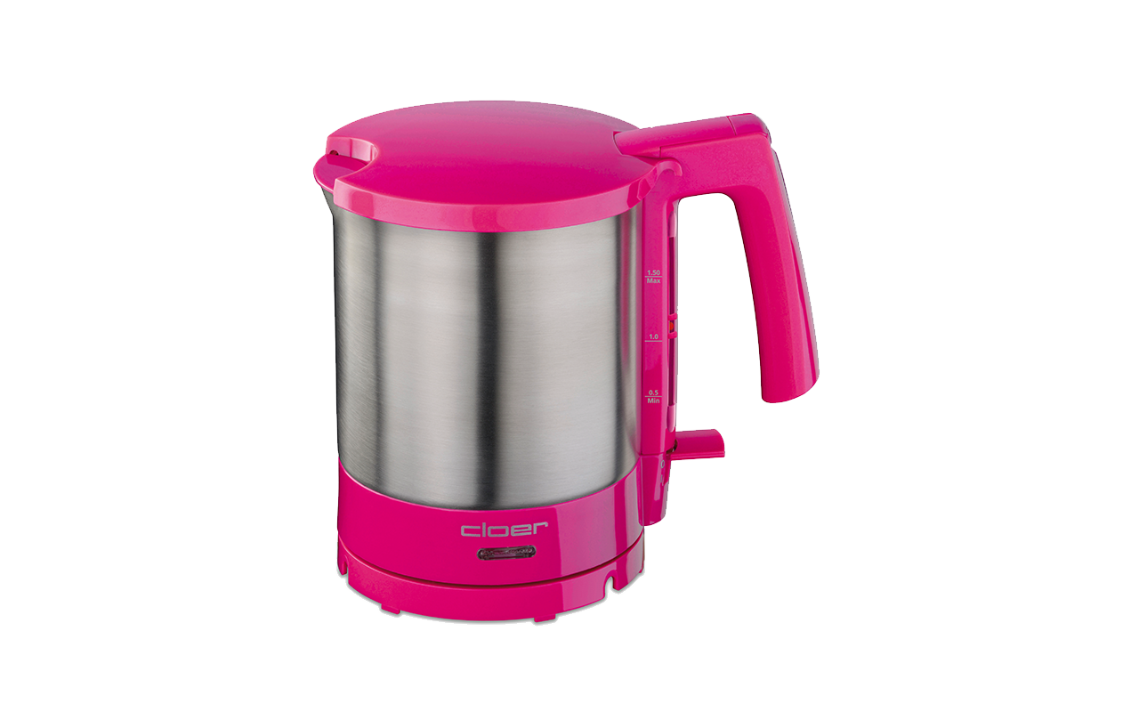 Wenn das übliche Einerlei aus Schwarz, Weiß und Silber zu langweilig geworden ist, bietet der Cloer Wasserkocher 4717 die passende Alternative. Der Wasserkocher mit einem Fassungsvermögen von bis zu 1,5 Litern ist mit den Bezeichnungserweiterungen -1, -2, -3 und -4 in den Trendfarben Pink, Gelb, Türkis und Grün erhältlich, die mit einem Kochbehälter aus mattiertem Edelstahl kontrastieren. Mit von der Partie sind natürlich die notwendigen Sicherheitsfunktionen wie Trockengeh- und Überhitzungsschutz sowie das automatische Abschalten, wenn das Wasser kocht. Zur komfortablen Bedienung und zum einfachen Wegräumen gehören der 360-Grad-Zentralkontakt und die Einhandbedienung zum Öffnen.
