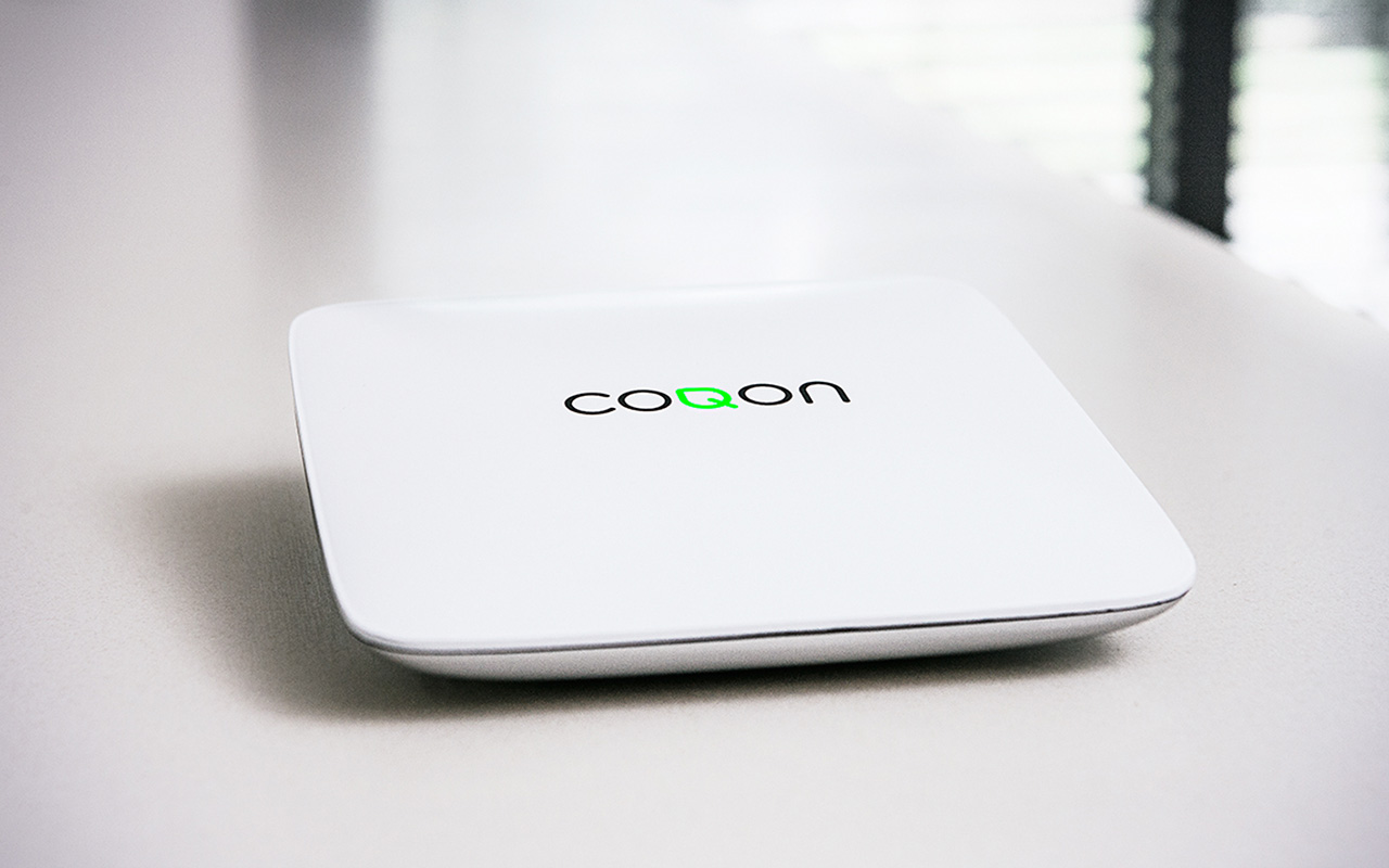 Die Coqon Qbox ist eine Smart Home Lösung, die als Innovation mit hoher Qualität, Design, Bedienkomfort und Funktionalität überzeugt. Mit dem modularen System können alle Funktionen eines intelligenten Gebäudemanagements realisiert werden, dazu zählen Sicherheit ebenso wie Heizung und Unterhaltung. Darüber hinaus lassen sich altersgerechte Assistenzsysteme, Gesundheits- und Fitnessdaten ebenso einbinden wie die Apple Smart Watch. Die Besonderheit: Alle Daten werden verschlüsselt übermittelt und erreichen einen Sicherheitslevel nach Bankenstandard. Die Steuerung erfolgt mittels PC oder mobil per Smartphone. Das Gateway präsentiert sich in einem weißen, minimalistisch gehaltenen Design mit diagonalen Linien und dem deutlich sichtbaren Coqon-Logo.
