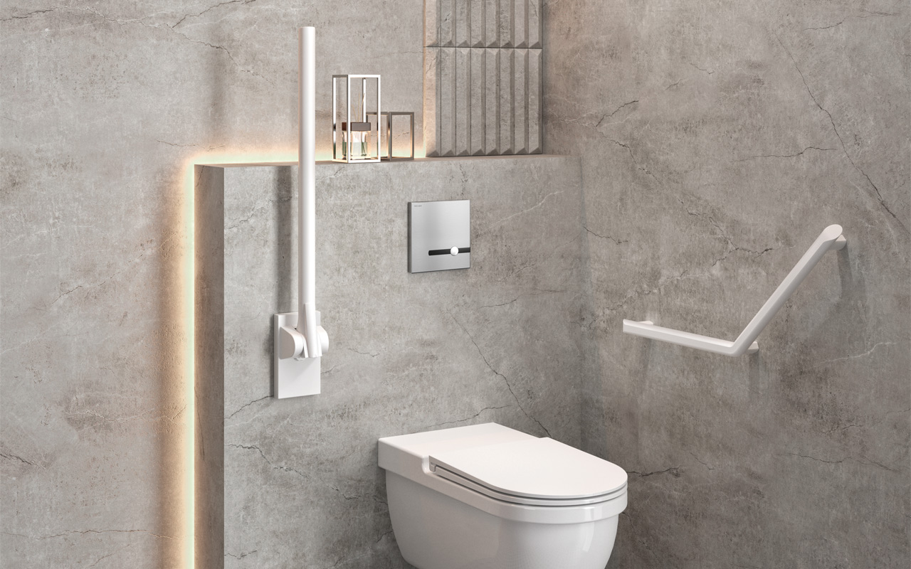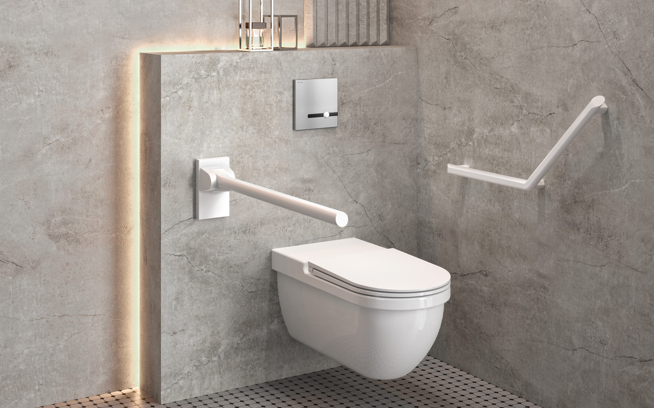 Der Stützklappgriff Be-Line von Delabie unterstützt Senioren oder bewegungseingeschränkte Personen bei der sicheren Benutzung des Bades. Dabei kann er sowohl im privaten Bereich wie auch im öffentlich-gewerblichen Bereich oder in Gesundheitseinrichtungen eingesetzt werden. Die Fertigungsqualität, verdeckte Befestigungen und der Verzicht auf Befestigungsflansche und Rosetten sorgen dafür, dass sich der Griff diskret in die Umgebung einfügt. In hochgeklappter Position ist er außerdem ideal für die gemeinsame Nutzung von Bädern geeignet. Der Griff ist abnehmbar, so dass er beispielsweise in Hotels ganz nach Bedarf eingebaut werden kann. Die ergonomische, flache Vorderseite und die abgerundete Form verhindern ein Verdrehen der Hand.