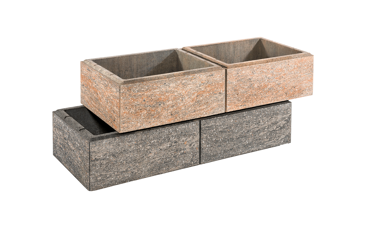 Leicht zu verlegen ist der Trockenmauerstein Tosa, der ein klassisches Mauerbild ergibt und lebhaft gemasert ist. Die Oberfläche ist glatt, die Kanten leicht gefast. Dadurch wirkt Tosa besonders edel. Die Mauer lässt sich mit Fundament, jedoch ohne Mörtel bis zu zwei Meter hoch bauen. Dies ist für eine moderne Trockenmauer dieser Art absolut außergewöhnlich. Weil Tosa oben und unten offen ist, eignet er sich auch als Pflanzstein. Tosa ist zwar ohne Nut und Feder, jedoch ist die Stabilität durch die Verfüllung drainagefähigen Materials gegeben. Der Normalstein hat eine Größe von 50 mal 40 mal 20 Zentimetern. Zudem gibt es Versatz-, Anfangs- und Endsteine. Die hohlen Steine sind dank ihrer Leichtigkeit problemlos bis zu einer Höhe von zwei Metern zu montieren, die oberste Reihe kann individuell begrünt werden. Die Farbtöne sind Muschelkalk und Quarzit.