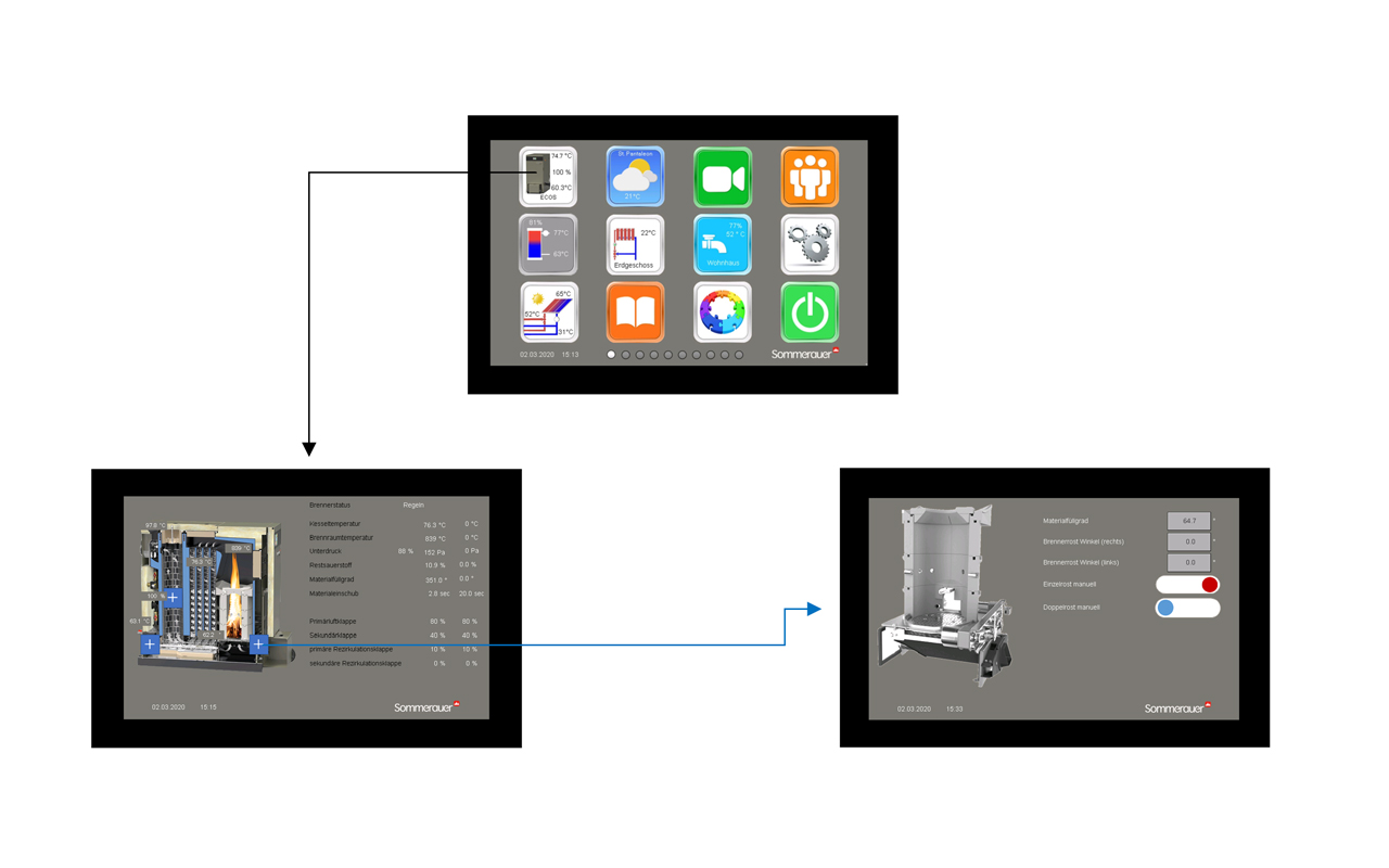 Die neuen ECOS® Heizungsanlagen von Sommerauer sind hybride Biomasse-Anlagen, die höchste Ansprüche erfüllen. Das innovative Brennersystem mit Unterdruck- und Lambda-Regelung sorgt für eine konstant saubere Verbrennung, bei unterschiedlichen Brennstoffen (Pellets oder Hackgut) und höchsten Wirkungsgraden, ohne mechanischen Umbau. Innerhalb der Modulbauweise können bis zu 30 Heizkreise komfortabel über ein 7-Zoll projektiv-kapazitives Touch-Display angesteuert werden. Die intelligente Energiesparfunktion ECO+ wertet Wettervorhersagedaten aus und schafft so ein vorausschauendes Heizen das Heizkosten einspart. Eine geringere Zahl von Einschaltintervallen führt zu einem stromsparenden Betrieb der Anlage, Brennstoffersparnis und geringeren Verschleiß von mechanischen Teilen.