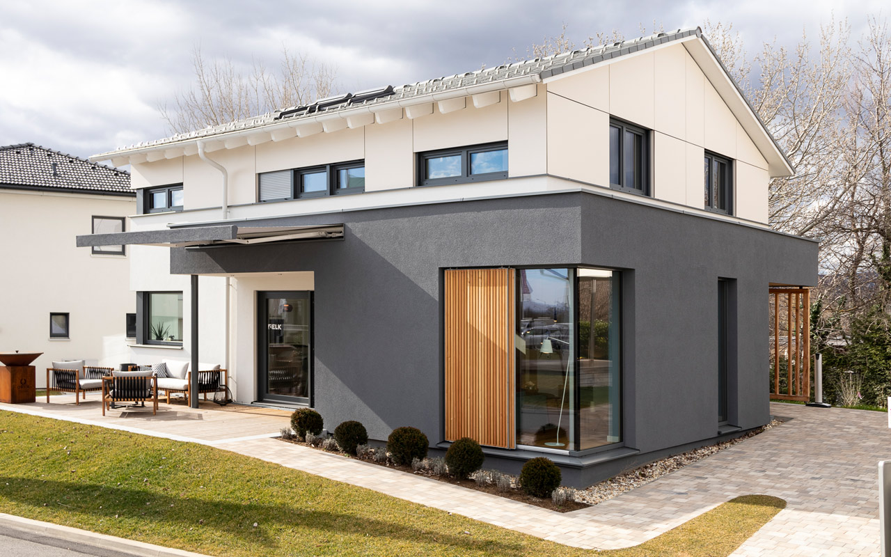 Die ELK Designserie der gleichnamigen Marke verbindet die Vorteile der Serienfertigung mit einer erweiterten Auswahl an Gestaltungsmöglichkeiten. Die Module sind klickbar und führen so zu einem individuellen Haus. Das offene Treppendesign, die in die Fassade integrierte Markise und der ebene Terrassenaustritt sind nur einige der Elemente, die das ELK Designhaus auszeichnen. Ergänzt wird das Angebot durch unterschiedliche Fensterlösungen, Hauseingangslösung, Dachformen und mehr. Je nach Bedarf des Kunden können Smart-Home-Lösungen in unterschiedlichen Stufen und Varianten vom Heizsystem bis zur kompletten Haussteuerung integriert werden.