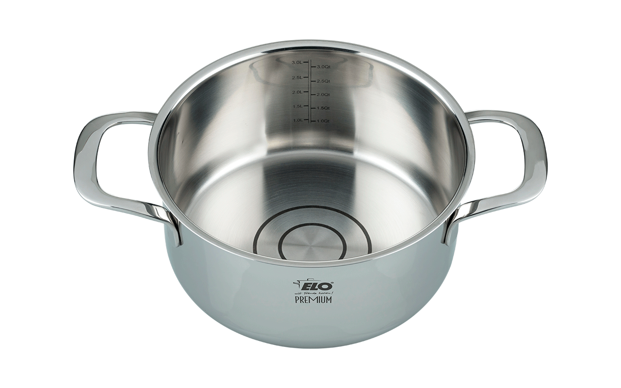 Hohe Qualität und Funktionalität zeichnen die Kochtöpfe Silicano+ aus dem Hause ELO aus. Ihre Besonderheit liegt im integrierten System zur Öldosierung. Am Boden des Topfes befinden sich zwei Ringe: Der kleine Ring steht für einen Teelöffel Öl, der große für einen Esslöffel. Damit lässt sich Öl im Rahmen einer gesundheitsorientierten Ernährung einfach ohne Messgerät abmessen. Die Silicano+ Töpfe haben einen Kupferkern im Boden, der die gleichmäßige Wärmeverteilung sichert. Innen sind sie hochglanzpoliert und mit einer Literskala versehen. Gegossene Edelstahlgriffe und ein Glasdeckel mit Silikonnadelstreifen runden die Ausstattung auf qualitativ hohem Niveau ab.