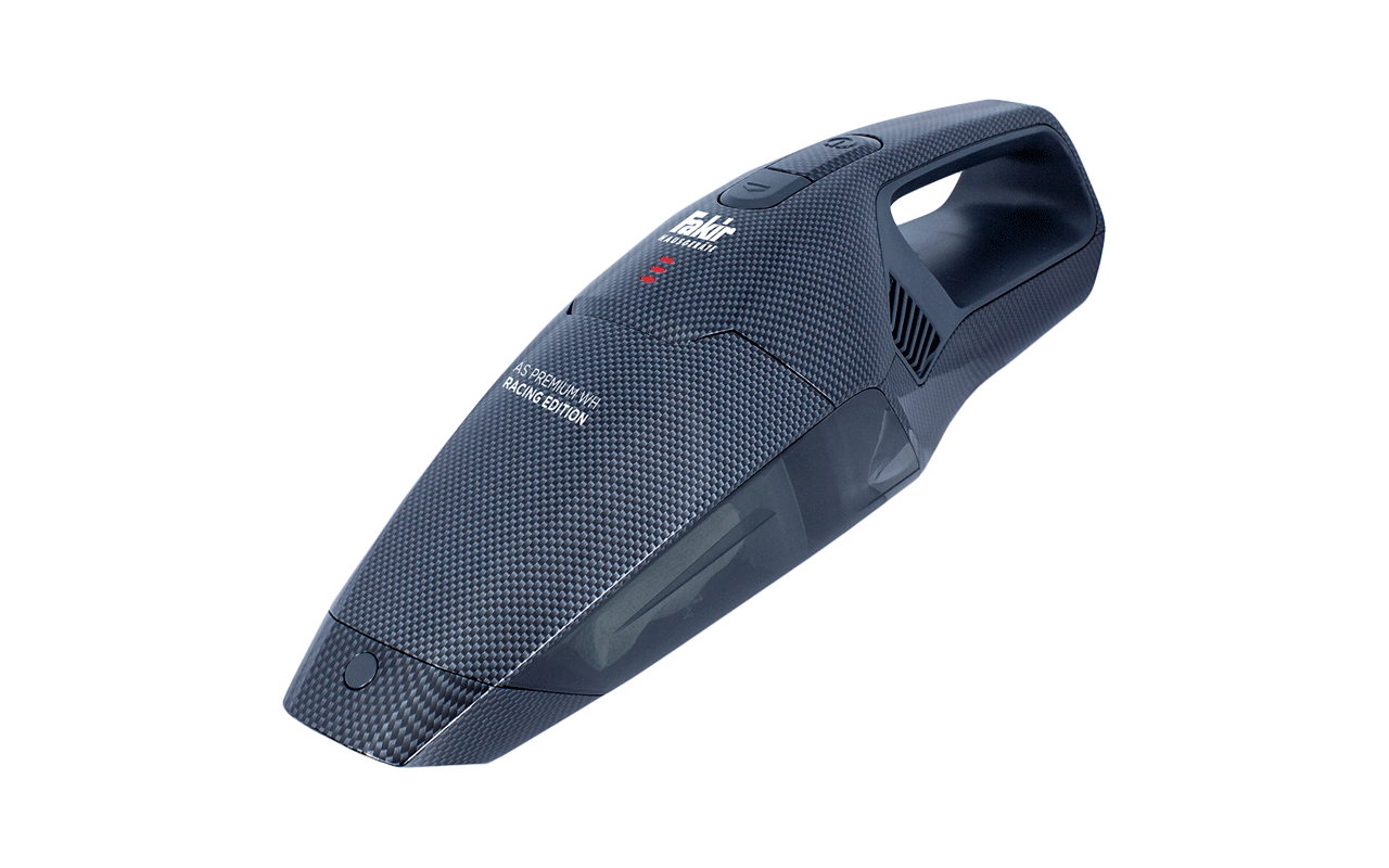 Zwei Saugstufen braucht es schon, dass der Fakir AS Premium WH Racing die Kraft seines 18,5-Volt-Motors und der 2,7 kPa Unterdruck auf empfindlichen Flächen nicht unbedacht einsetzt. Dank eines 5-Zellen-Akkus in Lithium-Ionen-Technologie kann er bis zu 25 Minuten lang zu Hause oder im Auto für Ordnung sorgen. Nicht nur die Kraft, sondern auch die Optik mit vielen Carboneffekten unterstreichen den Racingcharakter des Handstaubsaugers. Zusätzliche Düsen, darunter eine lange Fugendüse, stecken direkt im Gerät und müssen zum Wechsel nicht erst aus der Wand/Ladehalterung geholt werden. In dem gut zwei Pfund schweren Gerät stecken auswaschbare Filter.