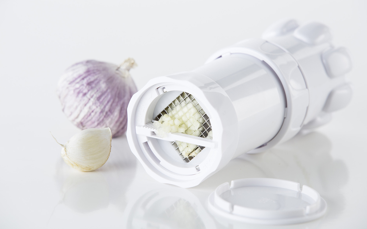 Der Knoblauchschneider aus dem Hause Genius überzeugt mit Innovation und Funktionalität. Statt den Knoblauch zu pressen, wird er durch eine einfache Drehung in gleich große Würfel zerteilt und sichert damit auch den Geschmack. Wird die Knoblauchzehe nicht vollständig gebraucht, kann sie im Schneider bleiben. Der aromadichte Deckel erhält den Geschmack, der Knoblauch kann im Kühlschrank aufbewahrt werden. Der Knoblauchschneider kann in der Spülmaschine gereinigt werden.
