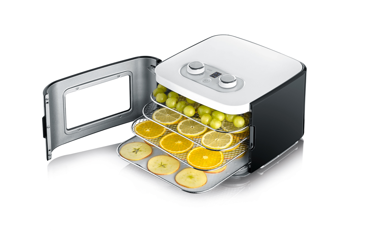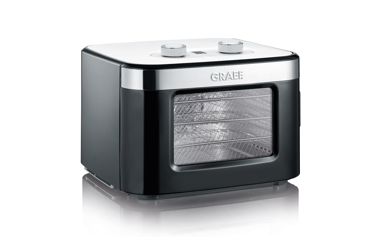 Der Mini-Dehydrator DA2042 von Graef mit seiner kompakten Bauweise wurde speziell für kleine Küchen entwickelt. Der Innenraum kann individuell mit Einschüben aus Edelstahl bestückt werden. So lassen sich beispielsweise auch hohe Gefäße für die Zubereitung von Joghurt in den DA2042 stellen. Die Temperatur kann von 35°C bis 80°C variiert werden. Die Bedienung funktioniert dank des Drehreglers einfach und intuitiv.
