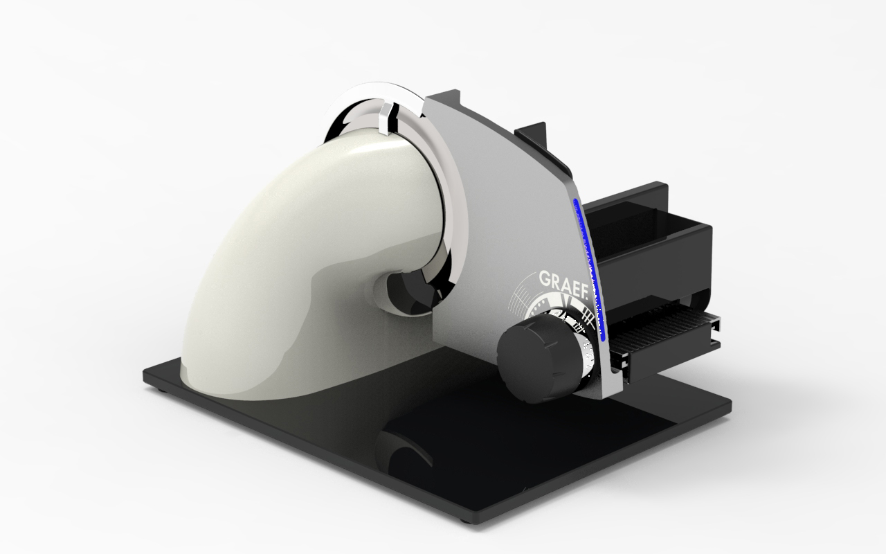 Der Allesschneider SKS700 von Graef ist aus Vollmetall gefertigt und verfügt über einen eloxierten Anschlag. Auffällig ist sein klassisches Design, das mit modernen Akzenten versehen ist. Er ist in drei verschiedenen Farben, jeweils mit verchromten Designelementen, erhältlich. Für den Bedienkomfort sorgt vor allem die Beleuchtung: Der beleuchtete Schneidebereich macht die Benutzung auch in dunkleren Räumen oder Nischen sicher und zeigt deutlich alle wichtigen Elemente. Auch die Einstellung der Schnittbreite und das Wechseln des Messers funktionieren denkbar einfach. Der Komfortschlitten ermöglicht eine einfache und sichere Einhandbedienung.