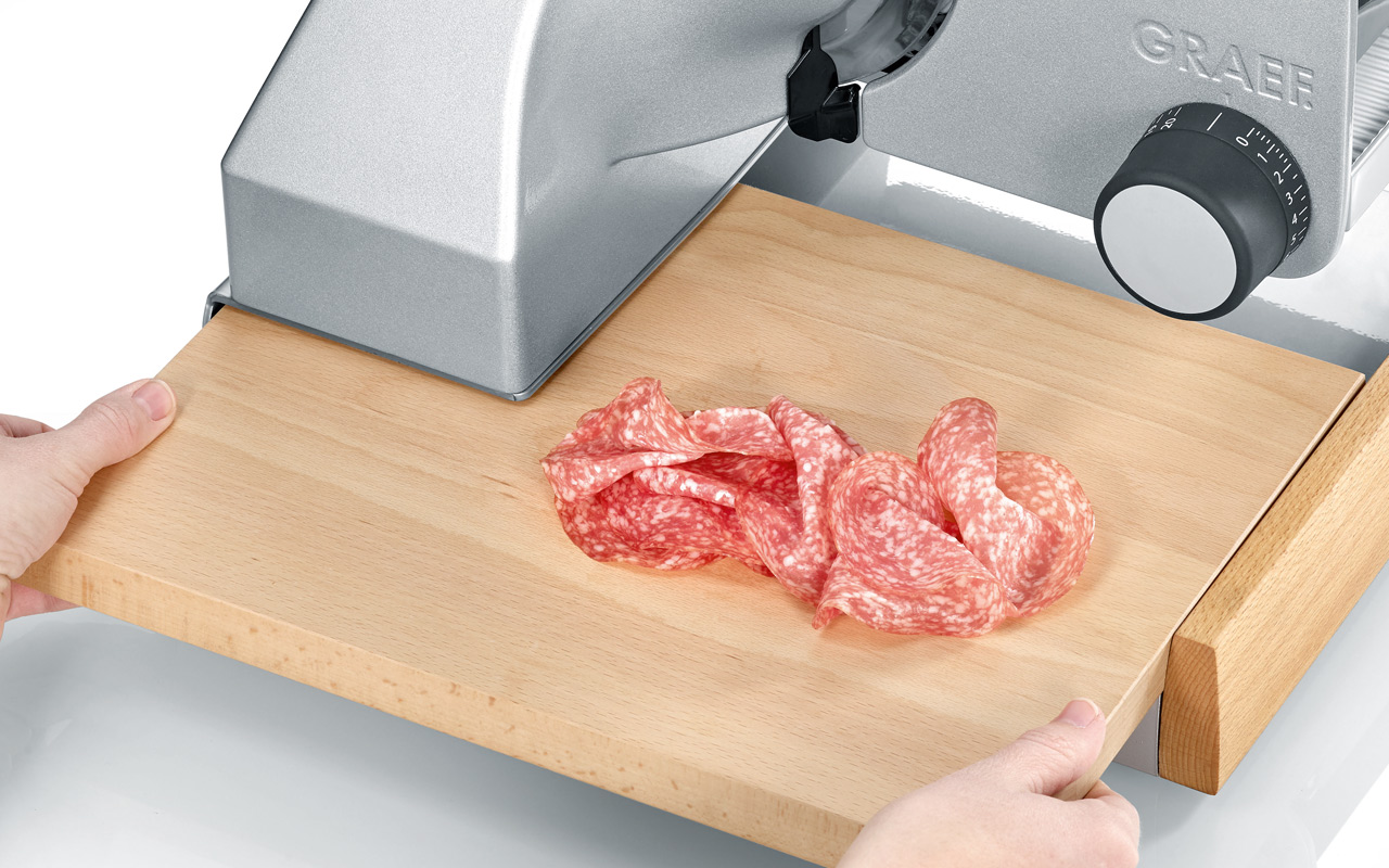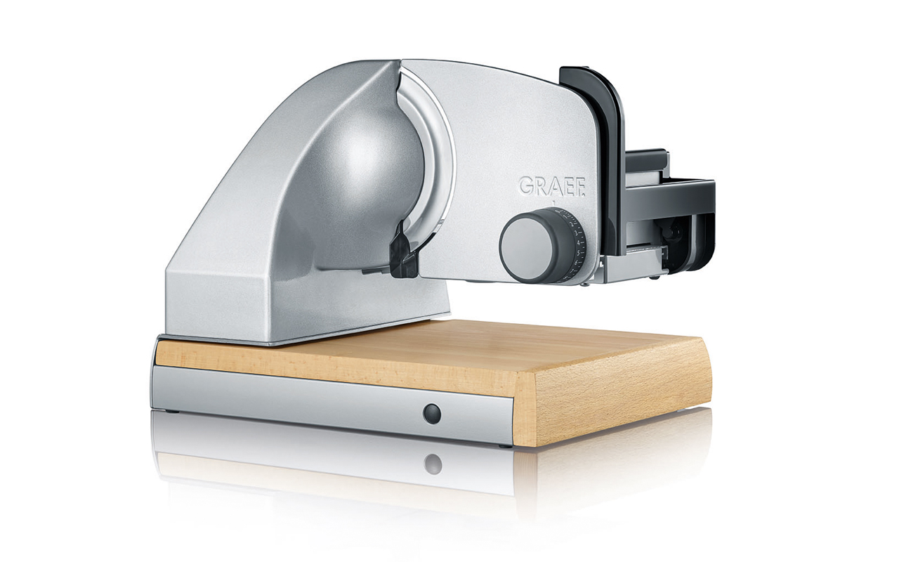 Der Allesschneider SKS850 von Graef ist aus Vollmetall gefertigt und verfügt über einen leisten, 170 Watt starken Kondensatormotor. Durch die verwendeten Materialien ist er in jeder Küche ein optisches Highlight. Das glatte Vollstahlmesser mit Hohlschliff eignet sich perfekt für hauchdünne Schnitte. Der stabile, leichtgängige Schlitten mit Edelstahlauflage erleichtert die Benutzung zusätzlich. Die Bodenplatte hat ein herausnehmbares Schneidbrett und eine Messerschublade, beides aus hochwertigem Buchenholz gefertigt. Kleinere Lebensmittel können schnell und restlos mit dem MiniSlice-Aufsatz geschnitten werden.