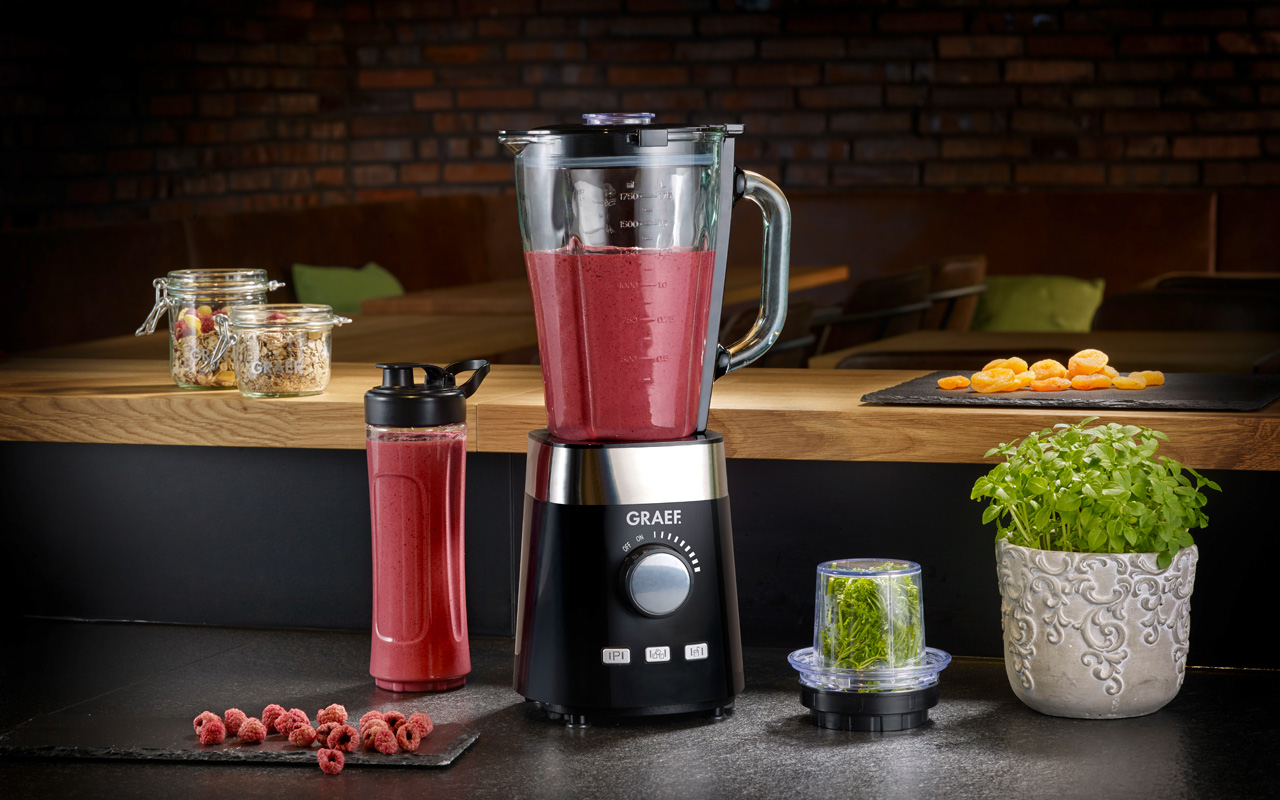 Der Standmixer TB500 von Graef macht die frische Verarbeitung von Lebensmitteln möglich. So verfügt er beispielsweise auch über zwei Automatik-Programme für Smoothies und Crushed Ice, sowie eine Pulse-Taste und eine variable Geschwindigkeitseinstellung. Der hochwertige, abnehmbare Glasbehälter fasst 1,75 Liter, hat eine Ausgießtülle und einen integrierten Dosierbecher. Das 4-flügelige Edelstahlmesser ist ebenfalls abnehmbar. Im Design präsentiert sich der TB500 puristisch und als deutlich erkennbares Mitglied der Graef Produktfamilie.