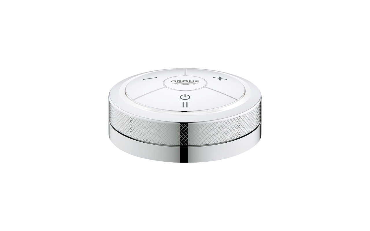 Der Grohe F-digital Controller, die digitale Fernbedienung für Wanne und Brause, schafft einen maximalen Gestaltungsspielraum im Badezimmer und in der Küche dank kabelloser, digitaler Technologie. Das innovative Produkt verbindet hohe Qualität mit Design und Bedienkomfort. Der digitale Controller kann an jedem Ort und jeder Oberfläche angebracht werden – überall dort, wo er dem Nutzer den meisten Komfort bietet. Er kann Dusche, Wanne, Waschtisch oder Spüle steuern. Das ist insbesondere bei der Umsetzung von barrierefreien Bädern ein wichtiger Faktor. Die Temperaturverstellung erfolgt kinderleicht auf Tastendruck der entsprechenden Plus oder Minus Taste. Durch Drehen des äußeren Metallrings kann die Durchflussmenge reguliert werden. Das Baukastenprinzip von GROHE F-digital erleichtert die Designabstimmung im gesamten Bad. Für jede Art der Interaktion im Badezimmer lassen sich individuelle, digitale Lösungen zusammenstellen. Durch die Unterteilung des Digitalen Controllers in nur drei Bedienungselemente und Verwendung eindeutiger Symbole wird der Nutzer intuitiv durch die Funktion geführt. Der beleuchtete LED-Ring zeigt dem Nutzer durch Farbwechsel die Veränderung der eingestellten Wassertemperatur an. Bewährte GROHE Technologien wie GROHE TurboStat und GROHE StarLight sowie ausgeprägte Tests vor der Auslieferung garantieren höchste Qualität