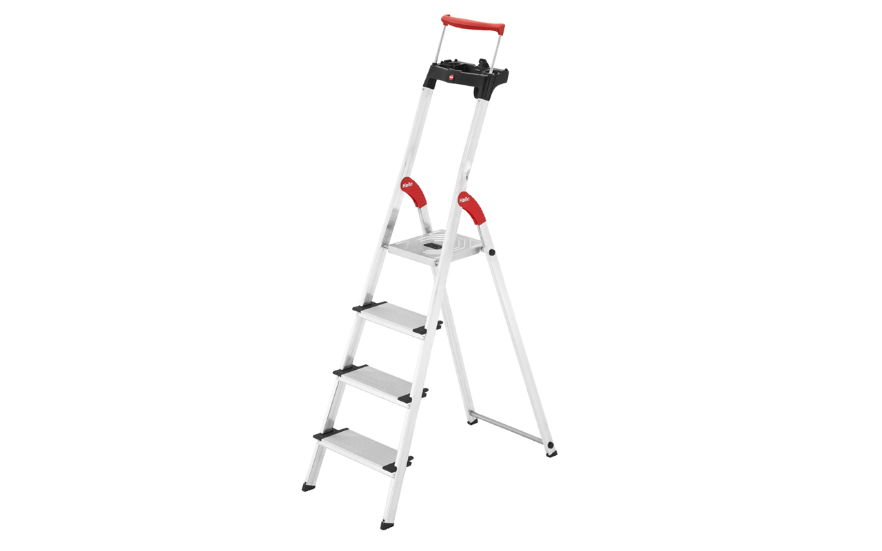 + vierstufige Alu-Sicherheitsleiter mit Multifunktionsschale und Sicherheits-Haltebügel