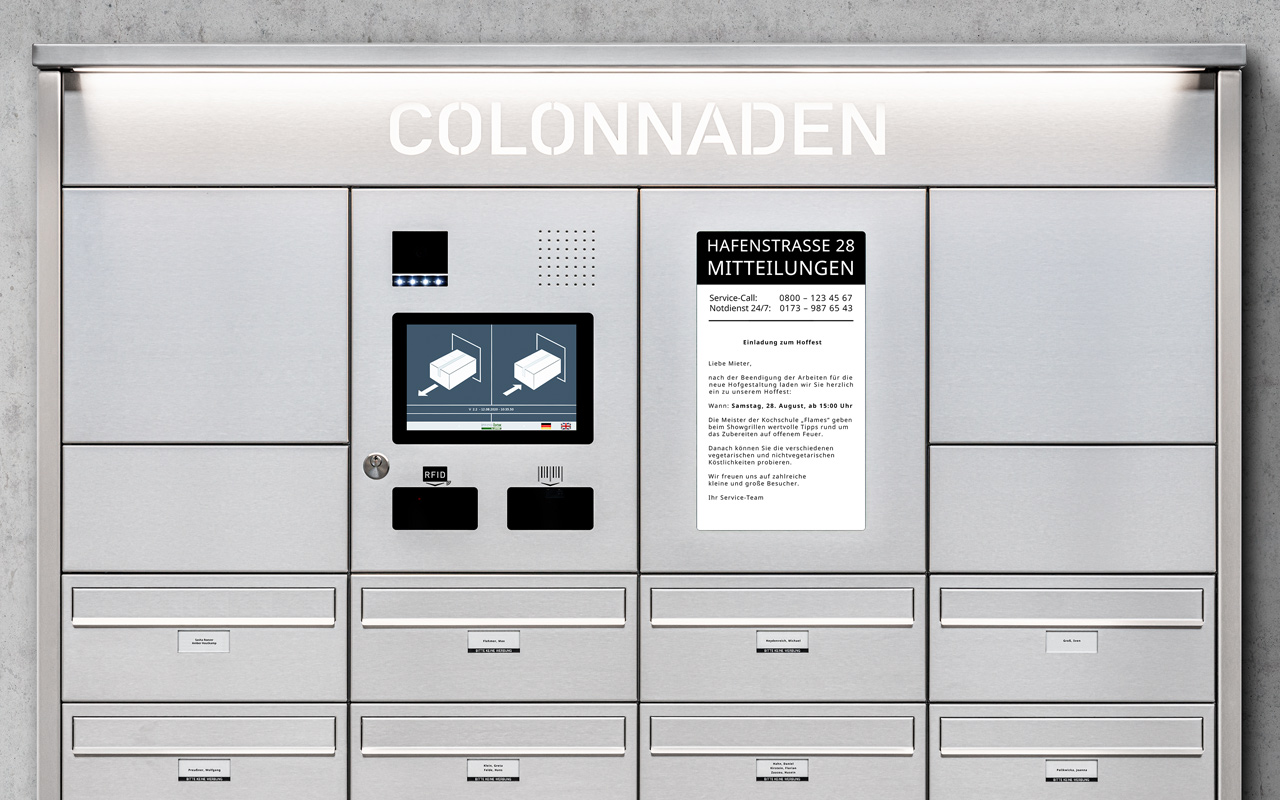 Der Intelliport Hub bietet zahlreiche Funktionen, mit denen die Gebäudekommunikation insbesondere bei großen Gebäuden in einer Lösung integriert werden kann. So stehen jetzt beispielsweise die Annahme von Post und Päckchen, Sprechanlage oder Anzeigetafeln in einem Gesamtsystem zur Verfügung. Das erhöht den Komfort für die Gebäudebetreiber ebenso wie für die Nutzer. Das System aus Soft- und Hardware ist modular aufgebaut; alle Elemente wurden gezielt aufeinander abgestimmt und zeichnen sich durch technische Feinheiten ebenso aus wie durchdachtes Design. Mit dem Intelliport Hub lassen sich bis zu mehr als 1.000 Teilnehmer in die digitalen Prozesse integrieren.
