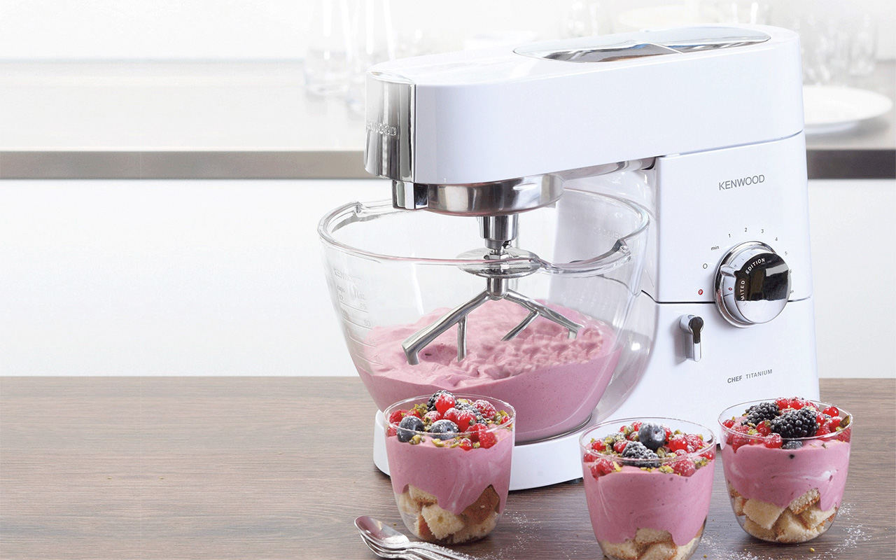 Kenwood hat mit der Küchenmaschine „Chef Titanium Brillantweiß KMC015“ ein Gerät auf den Markt gebracht, das mit hochglänzender, weißer Oberfläche in puncto Design neue Maßstäbe setzt. Auch die drei Rührelemente – der K-Haken, Knethaken und der Ballonschneebesen sind aus hochwertigem Edelstahl gefertigt und damit extrem langlebig. Bei der Rührschüssel handelt es ich um spezielles Borosilikatglas, dem extreme Temperaturschwankungen von Heiß zu Kalt nichts anhaben können. Dank der Mess-Skala, mit der die Glas-Rührschüssel versehen ist, können sämtliche Flüssigkeiten ganz einfach und komfortabel dosiert werden. Alle Rührelemente und auch die Glas-Rührschüssel wurden für eine einfache Reinigung in der Spülmaschine entwickelt.