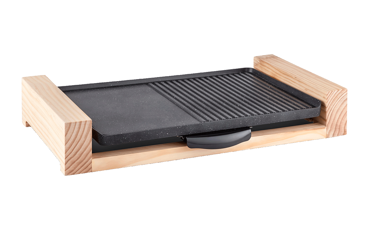 Nicht Kunststoff oder in Zweifelsfall extraheißes Metall bildet die Basis des Tischgrills Klarstein Lumberjack, sondern massives Holz. Das sieht zum einen rustikal-edler aus als die erwähnten Materialien, zum anderen wird es zwar heiß, aber in geringerem Maße. In der rustikalen Optik hängt eine 1.400 cm² große, beschichtete Platte aus Aluminium-Druckguss, die die Temperatur gleichmäßig über die ganze Fläche verteilt. Die ist zweigeteilt: Eine Hälfte hat Rippen, die andere ist glattflächig. Über einen Drehschalter lässt sich die Leistung von bis zu 2.300 Watt feinfühlig einstellen. Unter der Grillfläche ist eine entnehmbare Fettpfanne, damit so schnell nichts unnötig anbrennt.