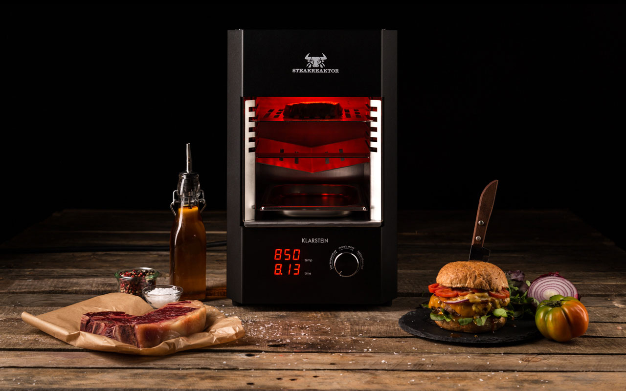 Der Trend, Steaks und anderes bei extrem hohen Temperaturen zu grillen, schwappt mit dem Klarstein Steakreaktor 2.0 aus teuren Restaurants in die Küche herüber. Dieser Elektrogrill mit Keramikheizelementen erzeugt bei Fleisch unter der Hitze von bis zu 850 Grad Celsius eine besondere karamellisierte Kruste, die ein einzigartiges Geschmackserlebnis bietet. Neben Fleisch können auch Gemüse und Gratins in dem Elektrogrill zubereitet werden. Fleischsäfte werden in einer Auffangschale gesammelt und können dann zu Soßen verarbetiet werden. Nicht nur die Zubereitung des Fleischs geht bei den hohen Temperaturen sozusagen im Handumdrehen: Auch die Aufheizzeit ist trotz der hohen Temperaturen mit fünf Minuten vergleichsweise kurz.