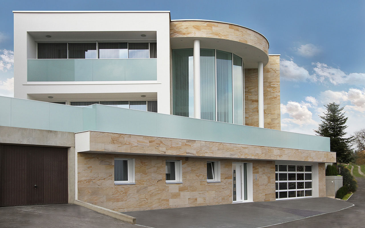 Die Knauf Sandstein-Design Wandplatten sind eine echte Innovation für Innen- und Außenwände. Zusätzlich überzeugen Sie durch hohe Qualität, Design und Funktionalität. Die Wandplatten werden aus Applikationen von Sandstein-Sedimentstrukturen gefertigt. Sie sind in verschiedenen Farben und unterschiedlich intensiven Strukturen verfügbar und können mit oder ohne Fugen verarbeitet werden. Die Wandplatten werden ausschließlich aus natürlichen Rohstoffen hergestellt. Sie sind für vielfältige Anwendungsbereiche geeignet: Sie können in allen rechteckigen Formaten in Sockel-, Wand- und Laibungsbereichen von Fenstern und Türen genutzt und direkt auf die Wand geklebt werden. Auch Rundungen und Eckausbildungen sind möglich. Die hohe Qualität des Materials sichert nicht nur die Beständigkeit gegen Frost, UV-Strahlung, Regen und Feuchtigkeit; dank der dreifach versiegelten Oberfläche entsteht auch ein Graffitischutz.